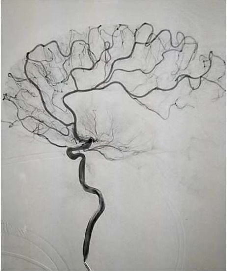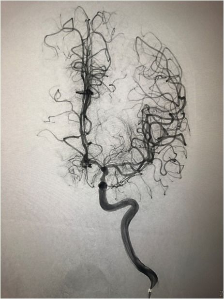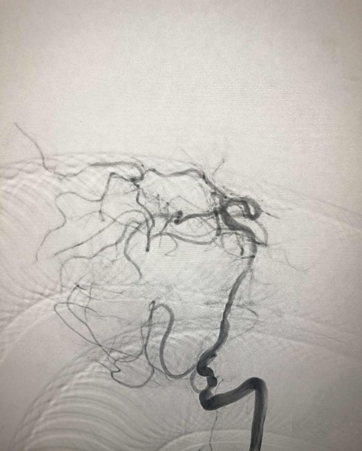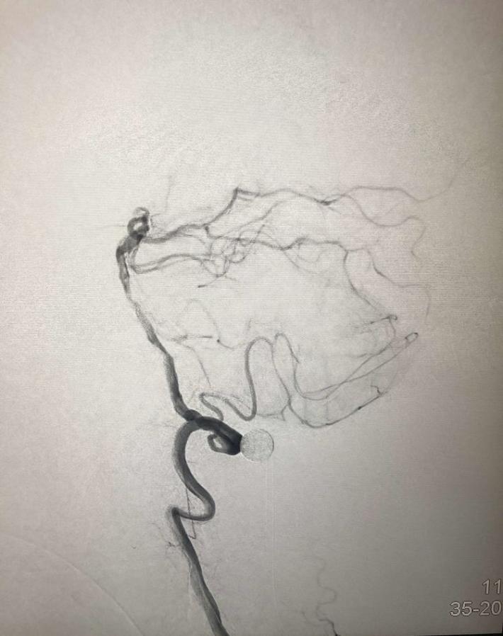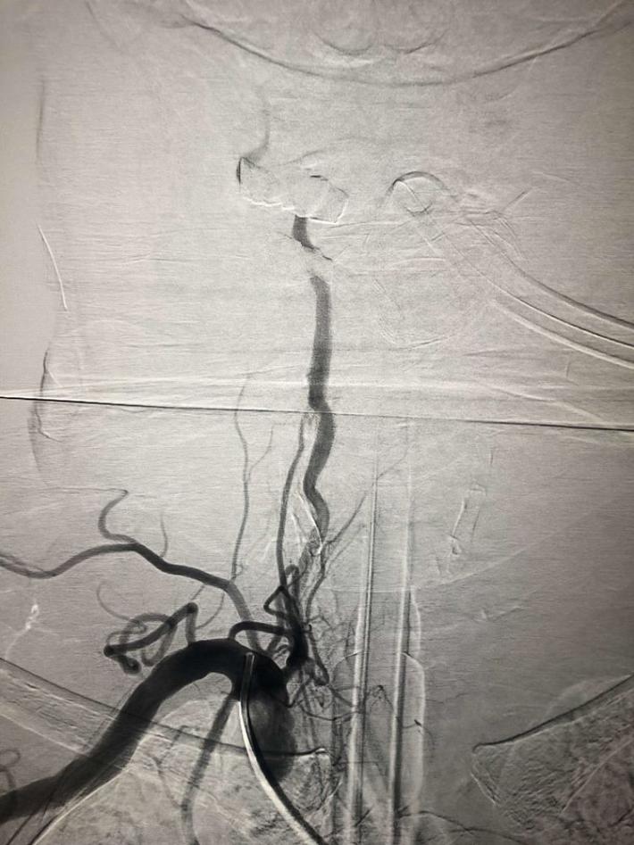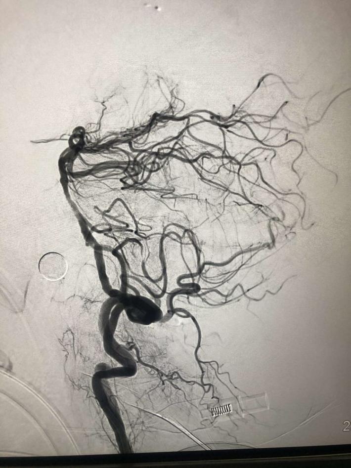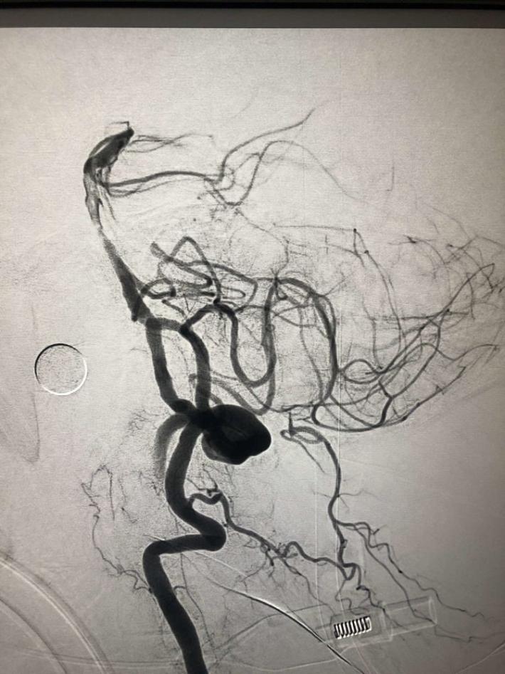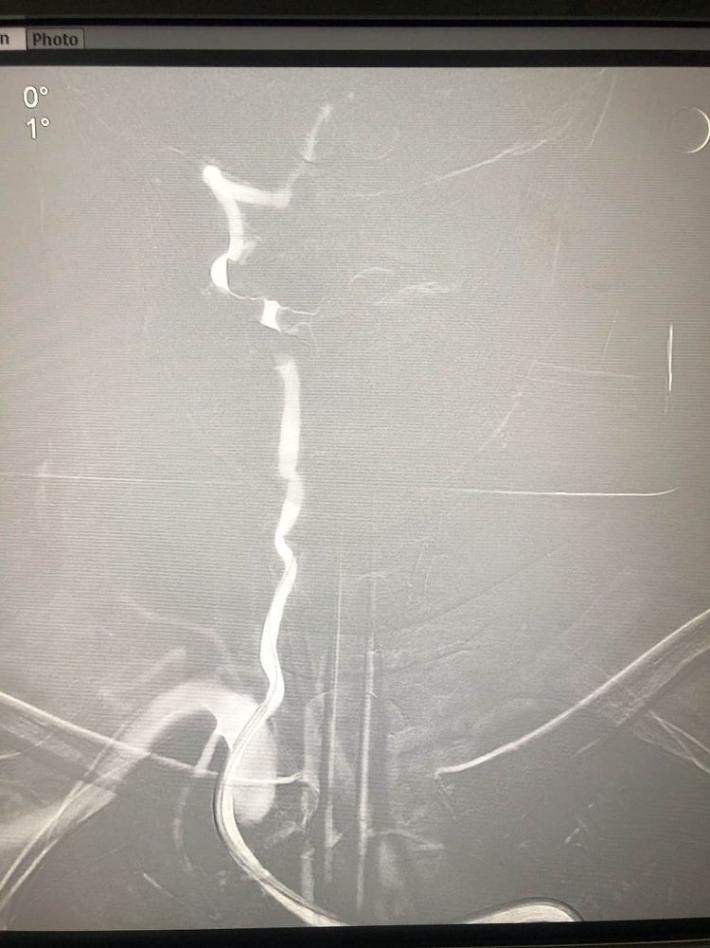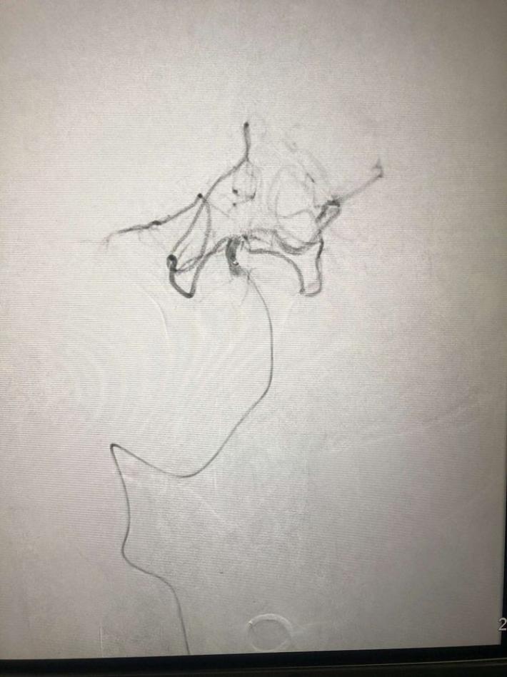 一把拉通后,前向血流即刻恢复至3级,双侧小脑上动脉、大脑后动脉、基底动脉尖显影。