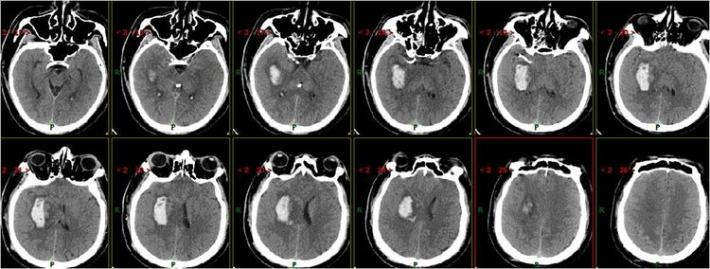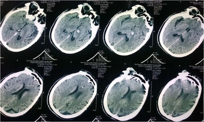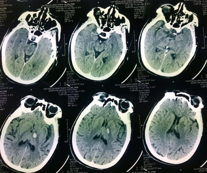 神经系统查体:神志清,精神差,饮水呛咳,双侧肢体肌力3级。NIHSS评分:11分。 于05.18 07:30(发病1小时)左右给予阿替普酶静脉溶栓治疗(具体不详),患者双侧肌力好转至4级,NIHSS评分改善至7分。 5月19日患者症状加重,出现意识水平下降, 神志昏睡,双侧肌力肌力2级,为求进一步诊治来我院。行头部CT提示:左侧丘脑出血。