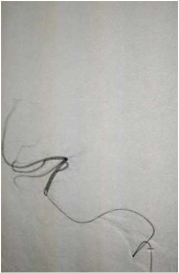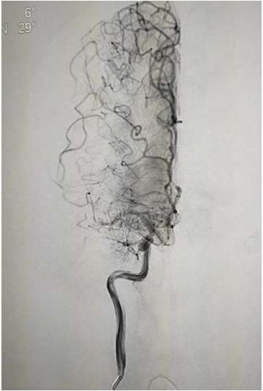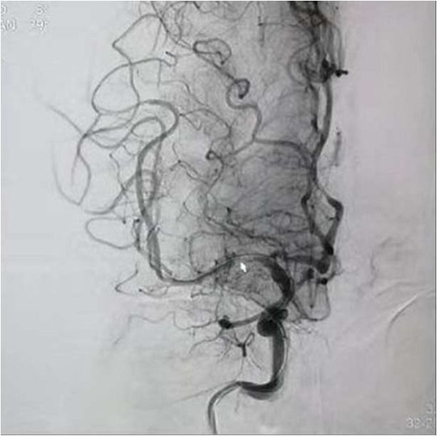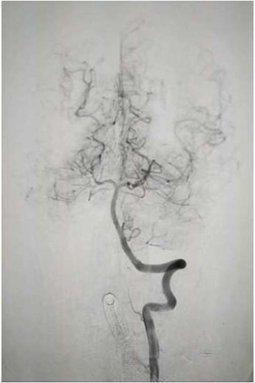 右侧椎动脉造影:基底动脉中段充盈缺损,基底动脉尖丢失。提示基底动脉中段原位狭窄基础上血栓形成,血栓脱落栓塞基底尖。