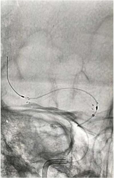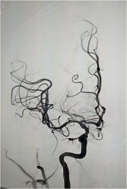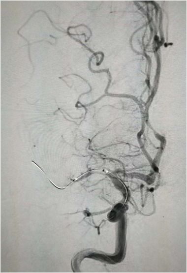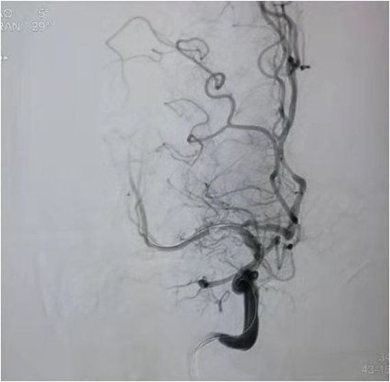 入院后75min,股动脉穿刺成功,后循环造影及右侧颈内动脉正侧位。