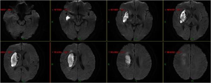 患者:赵**,男性,37岁,2018.11.02以“突发言语不清7小时左侧肢体屋无力3小时”为代主诉入院,既往糖尿病病史,入院神经系统查体阳性体征:嗜睡,精神差,言语欠清晰,示齿左侧鼻唇沟浅,伸舌左偏,左上肢肌力0级,左下肢肌力2级,左侧病理征阳性,余查体未见明显阳性体征,NIHSS评分10分(意识1+面瘫1+四肢7+构音1),GCS评分9分(睁眼3+语言3+运动3),洼田饮水试验2级。