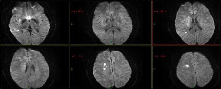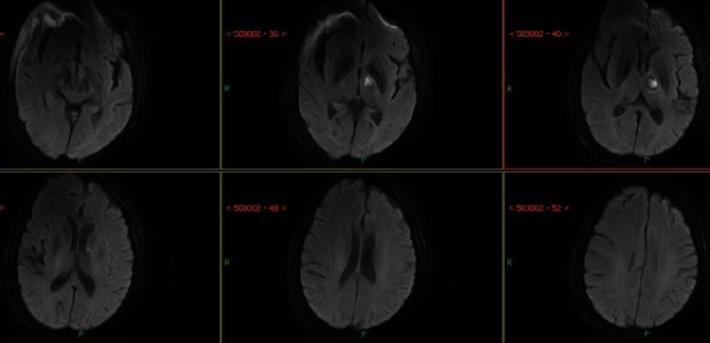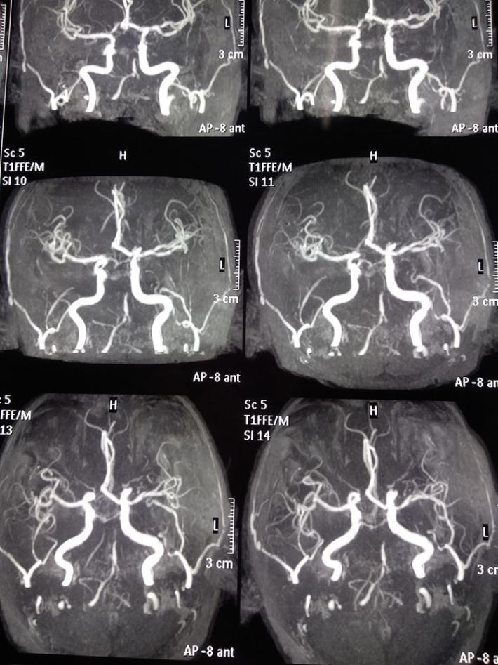 入院急查血未见明显异常指标,急查头部MRI+MRA:右侧半卵圆中心、右侧侧脑室旁多发急性脑梗死,右侧大脑中动脉重度狭窄,分枝稀疏。
