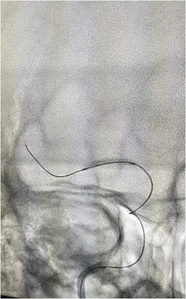 微导丝微导管通过闭塞部位,经微导管造影,确认在远端真腔。
