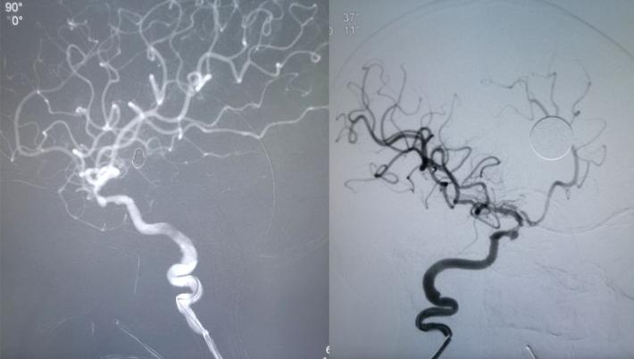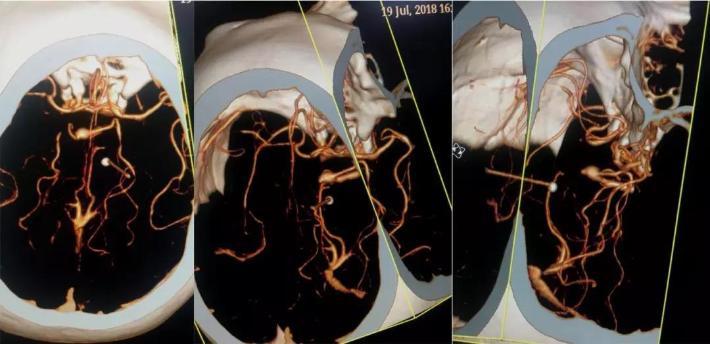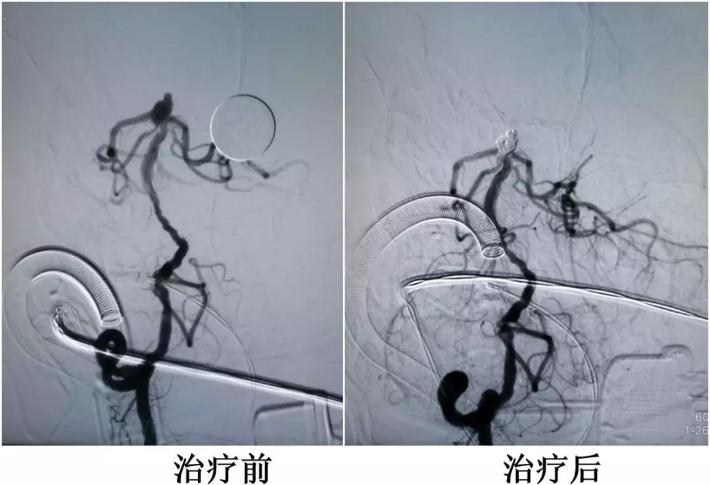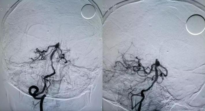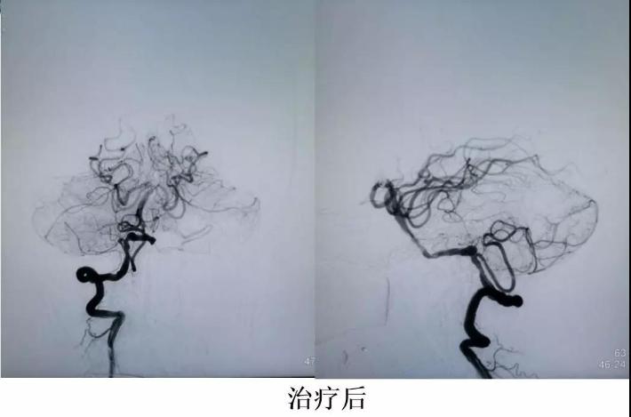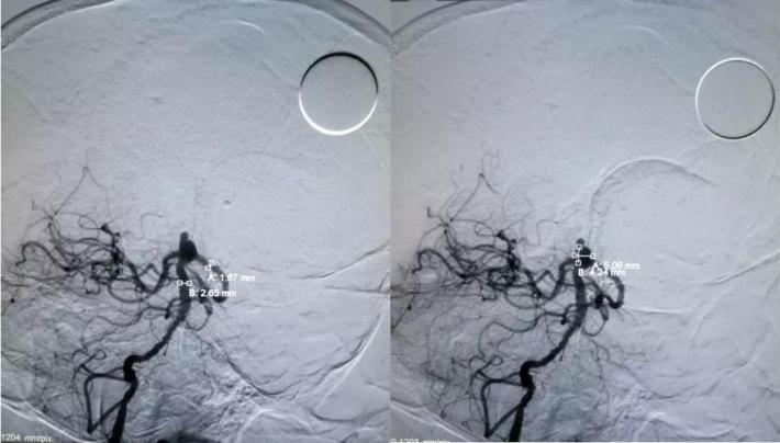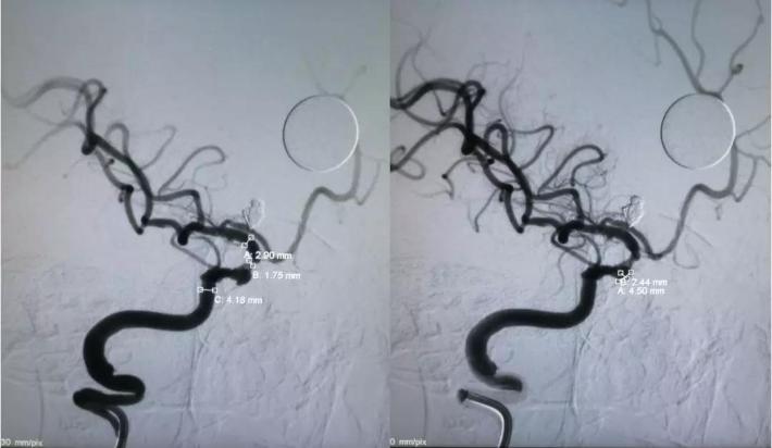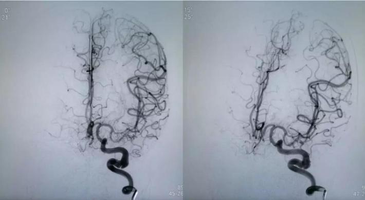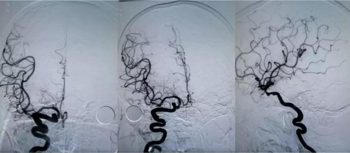 ✔Enterprise支架释放后,右侧大脑前动脉A1段未显影,考虑可能为支架打开后,对病变段血管的修复及一定血流导向作用,大脑中动脉前向血流增加,而原本纤细的左侧大脑前动脉A1段血流减少,对侧大脑前动脉通过前交通动脉向左侧大脑前动脉A2段主流供血,由于血流对冲作用至左侧大脑前动脉A1段不显影。后对侧评估前交通开放,对侧代偿良好,结束手术。术后患者亦未再出现新的神经系统体征,肢体活动及语言功能恢复良好,1周后头颅CT未见新发梗死灶。