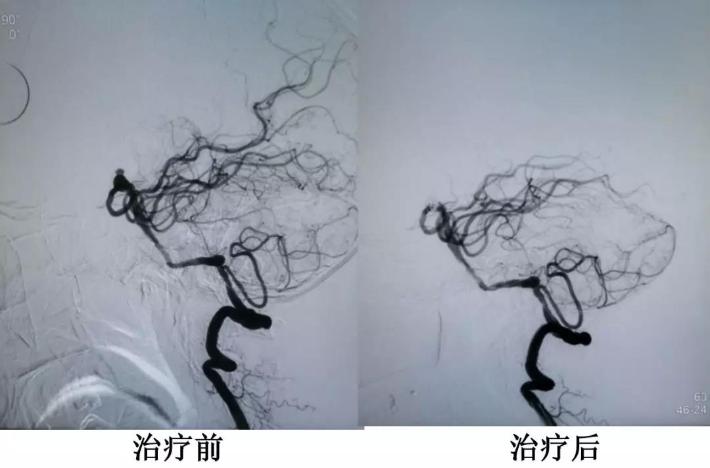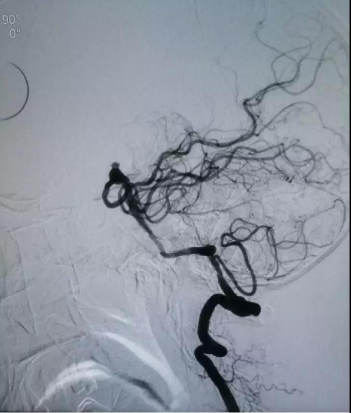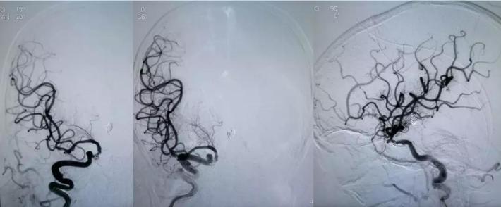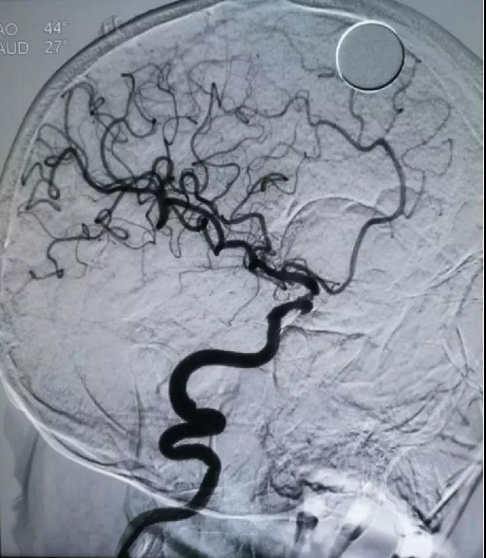对侧造影评估,前交通开放,左侧大脑前动脉经开放良好的前交通动脉向右侧大脑前动脉A2段各分支血管供血良好,结束手术