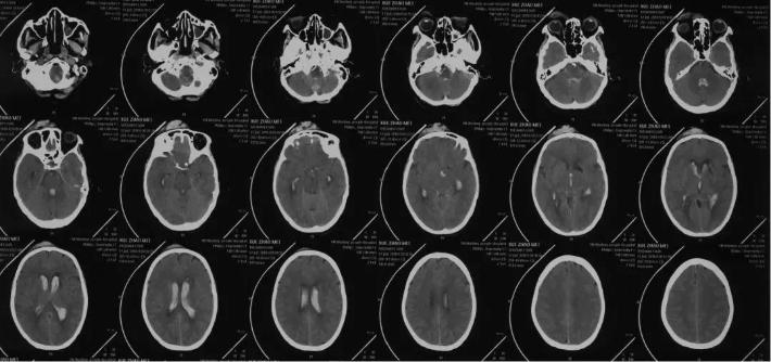 2、动态复查头颅CT,脑室积血明显减少,术后第二天拔除侧脑室外引流管,每日腰椎穿刺释放血性脑脊液。