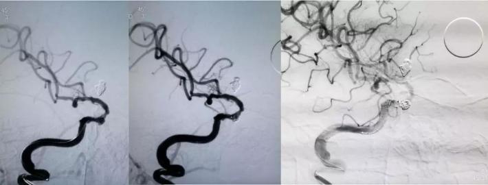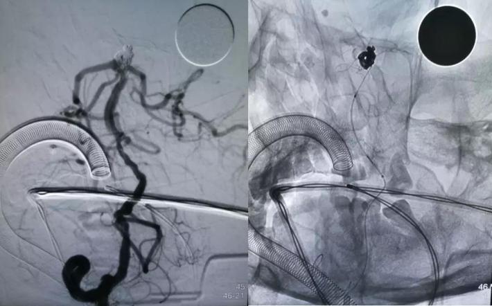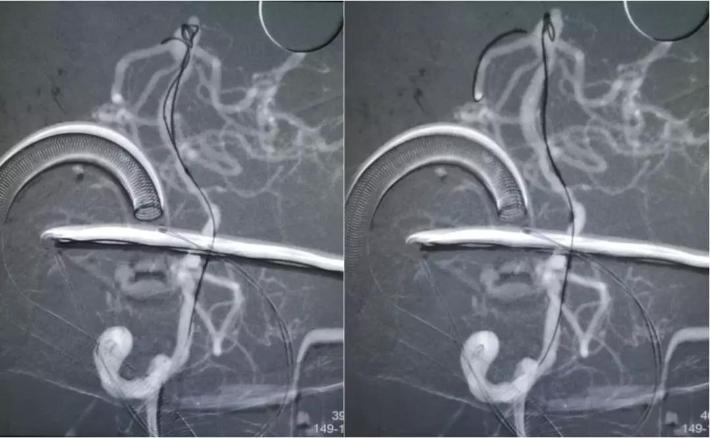 预置入支架导管,栓塞动脉瘤用微导管头端超选进入动脉瘤腔,通过支架导管送入Enterprise支架(4.5*22mm)并打开支架,填入弹簧圈栓塞夹层动脉瘤。但此时发现大脑前动脉A1段不显影。