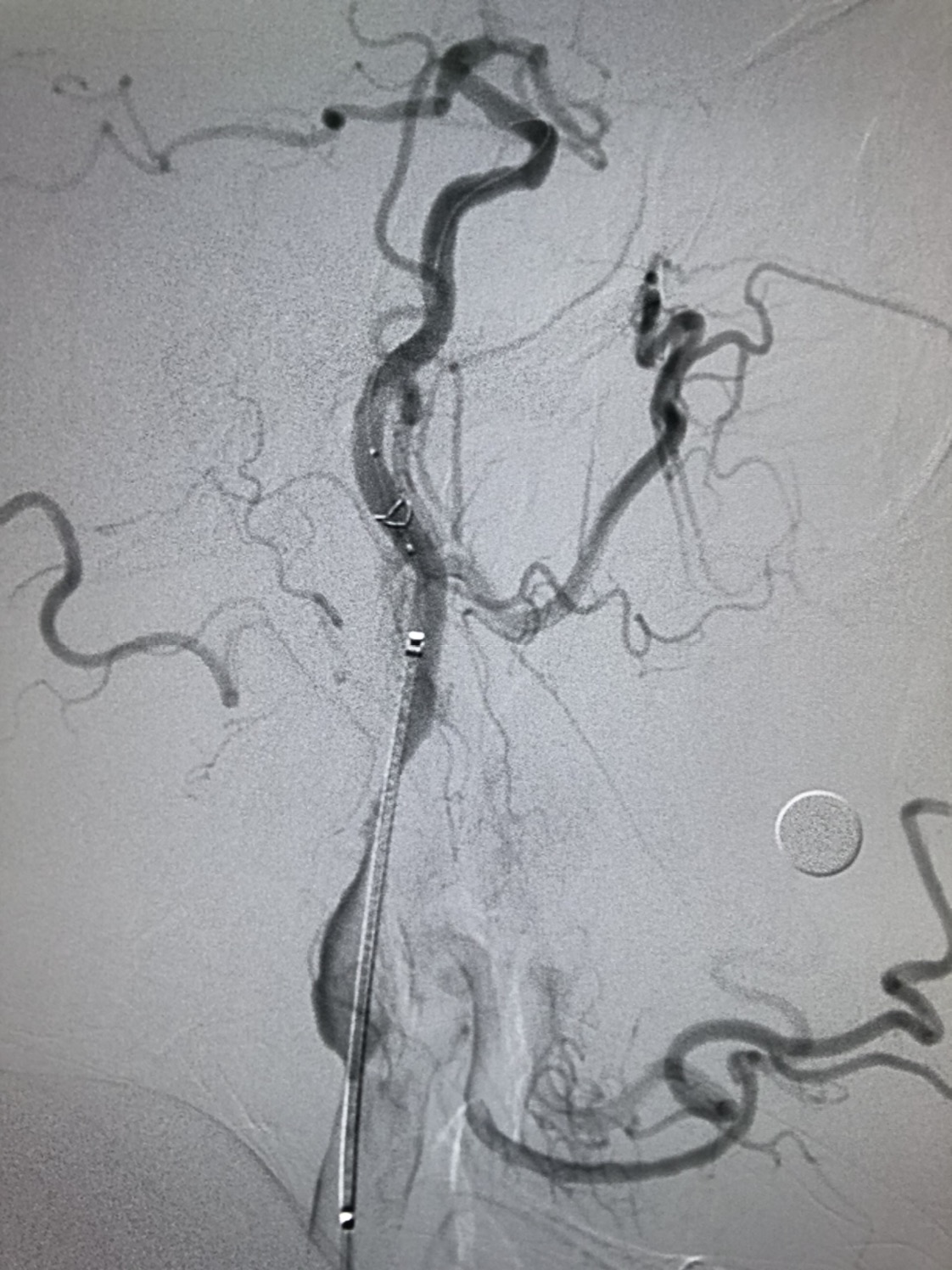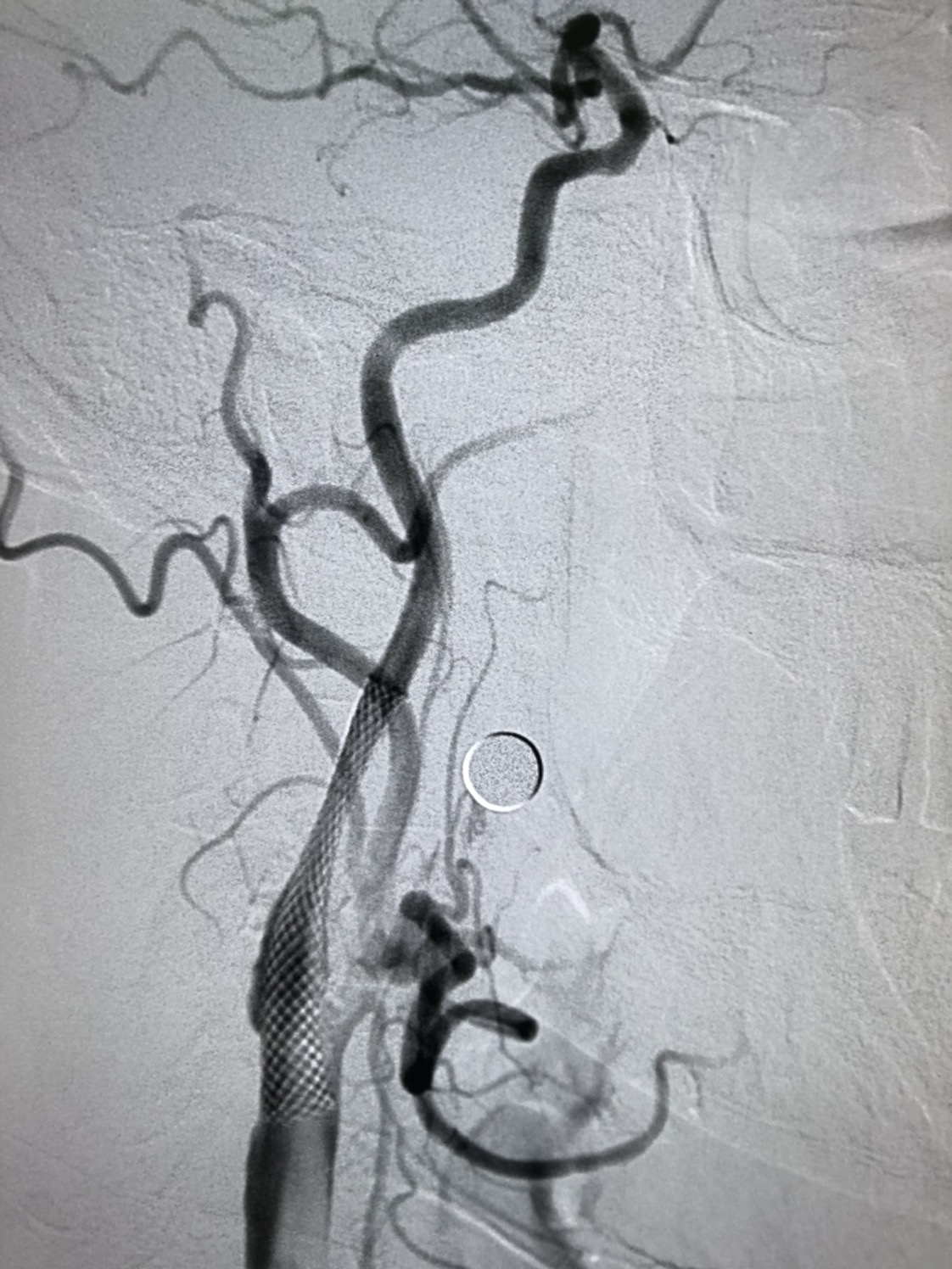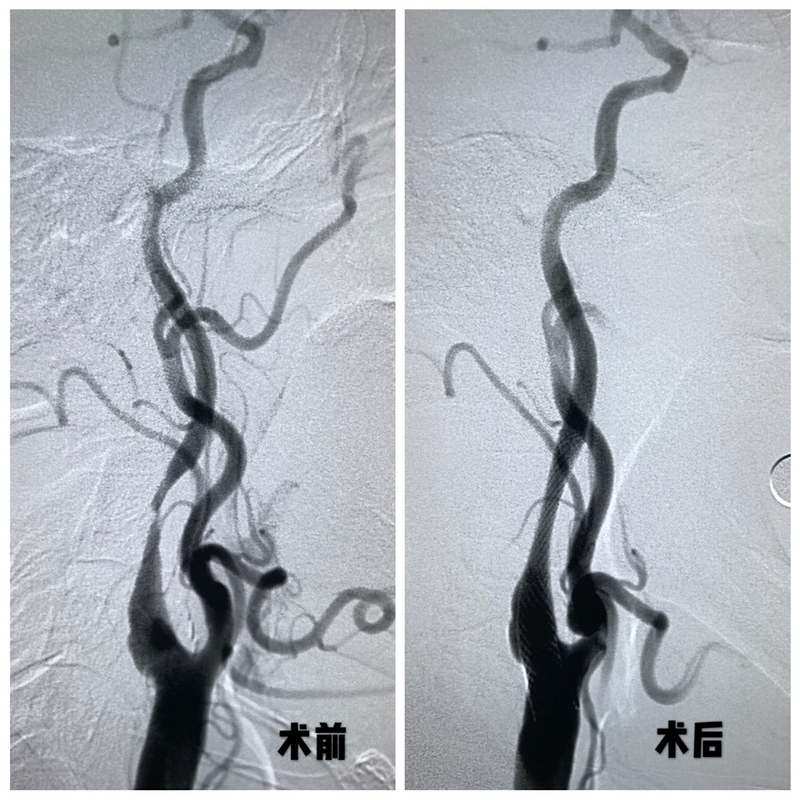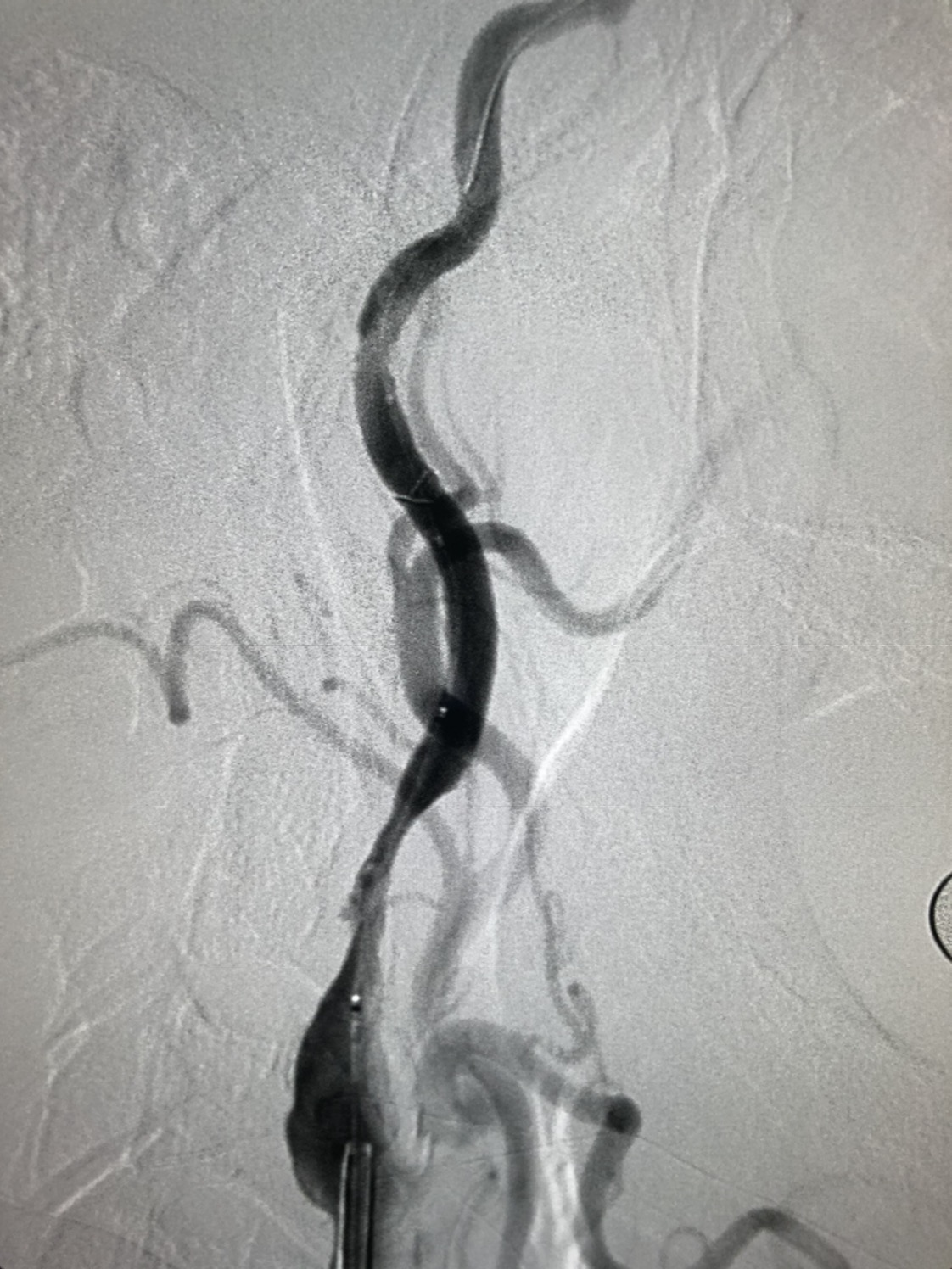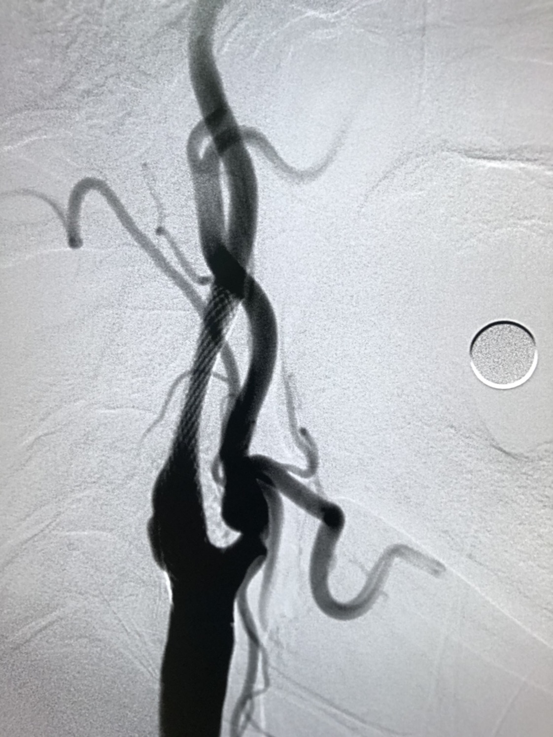 明确诊断后,考虑患者存在缺血症状,造影提示颈内动脉线性狭窄,同时右侧颈内动脉窦部可见粥样硬化斑块伴溃疡,系患者的罪犯血管。同时因患者后循环血管发育不良,基底动脉纤细伴狭窄,后循环血供均由前循环胚胎型大脑后动脉供应。不积极干预,出现恶性卒中风险极大,因患者颈部较短,且病变部位偏高,建议患者行颈动脉支架成形术。