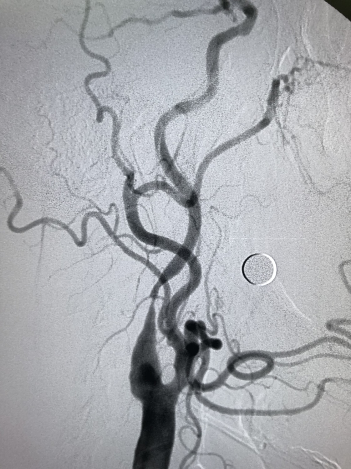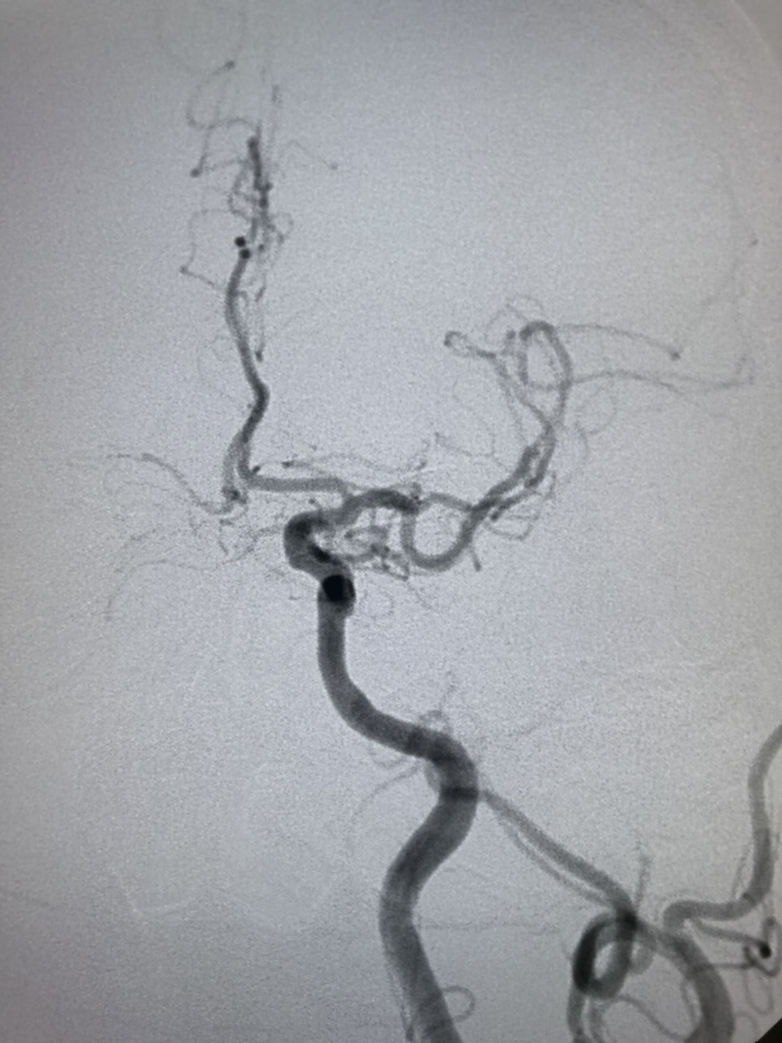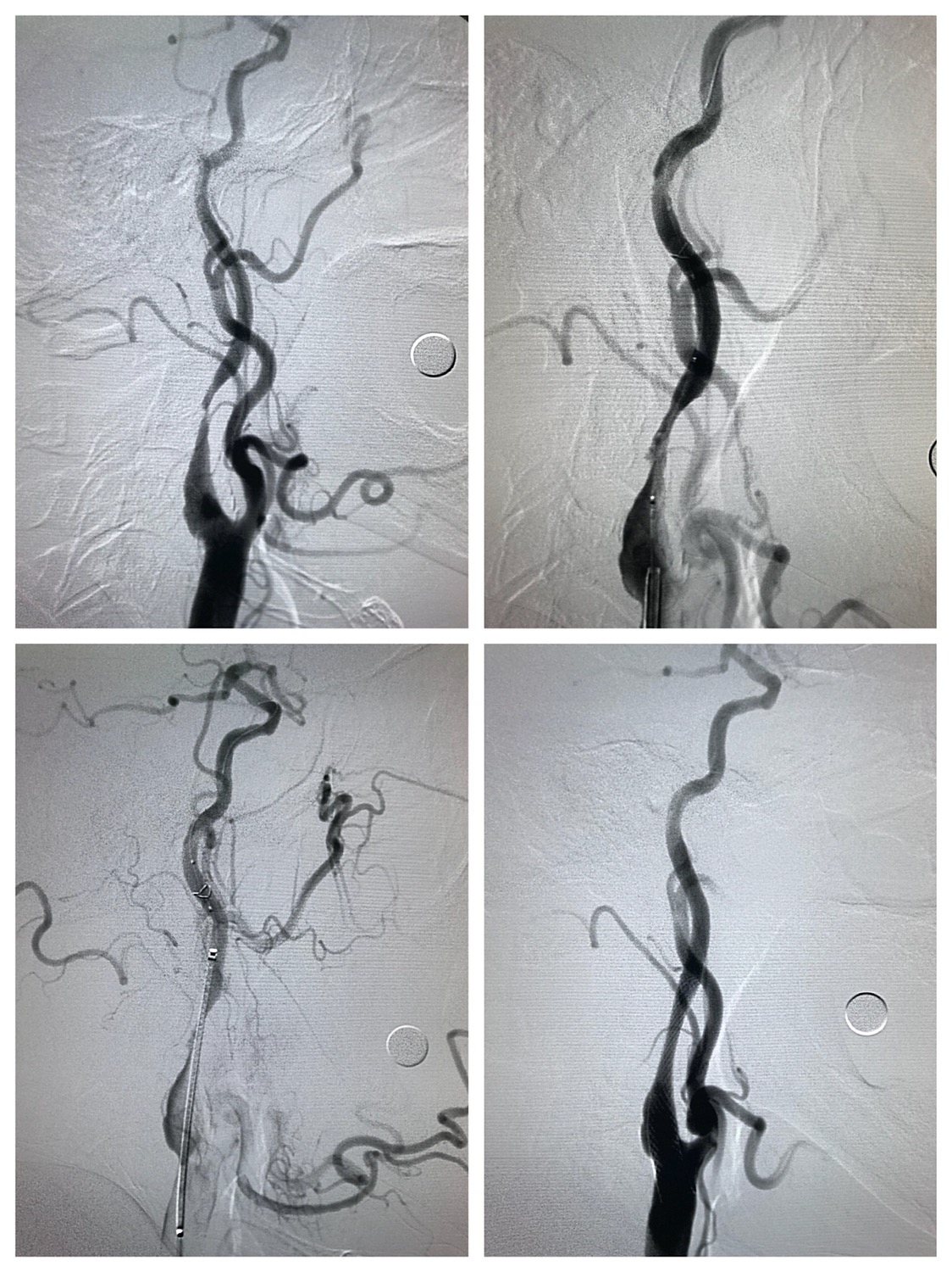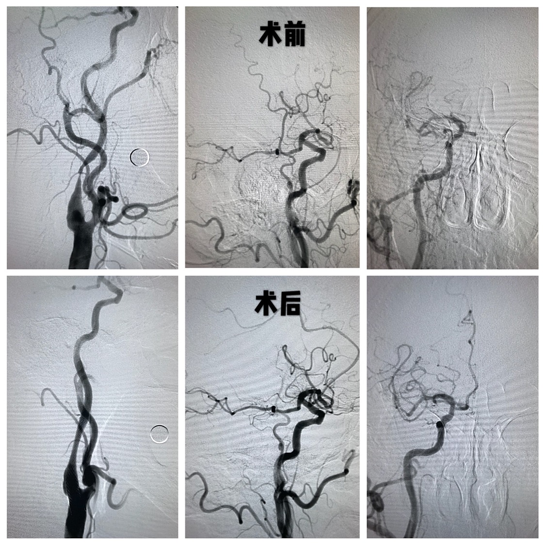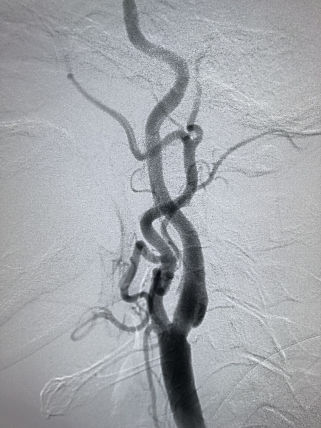 明确诊断后,考虑患者存在缺血症状,造影提示颈内动脉线性狭窄,同时右侧颈内动脉窦部可见粥样硬化斑块伴溃疡,系患者的罪犯血管。同时因患者后循环血管发育不良,基底动脉纤细伴狭窄,后循环血供均由前循环胚胎型大脑后动脉供应。不积极干预,出现恶性卒中风险极大,因患者颈部较短,且病变部位偏高,建议患者行颈动脉支架成形术。