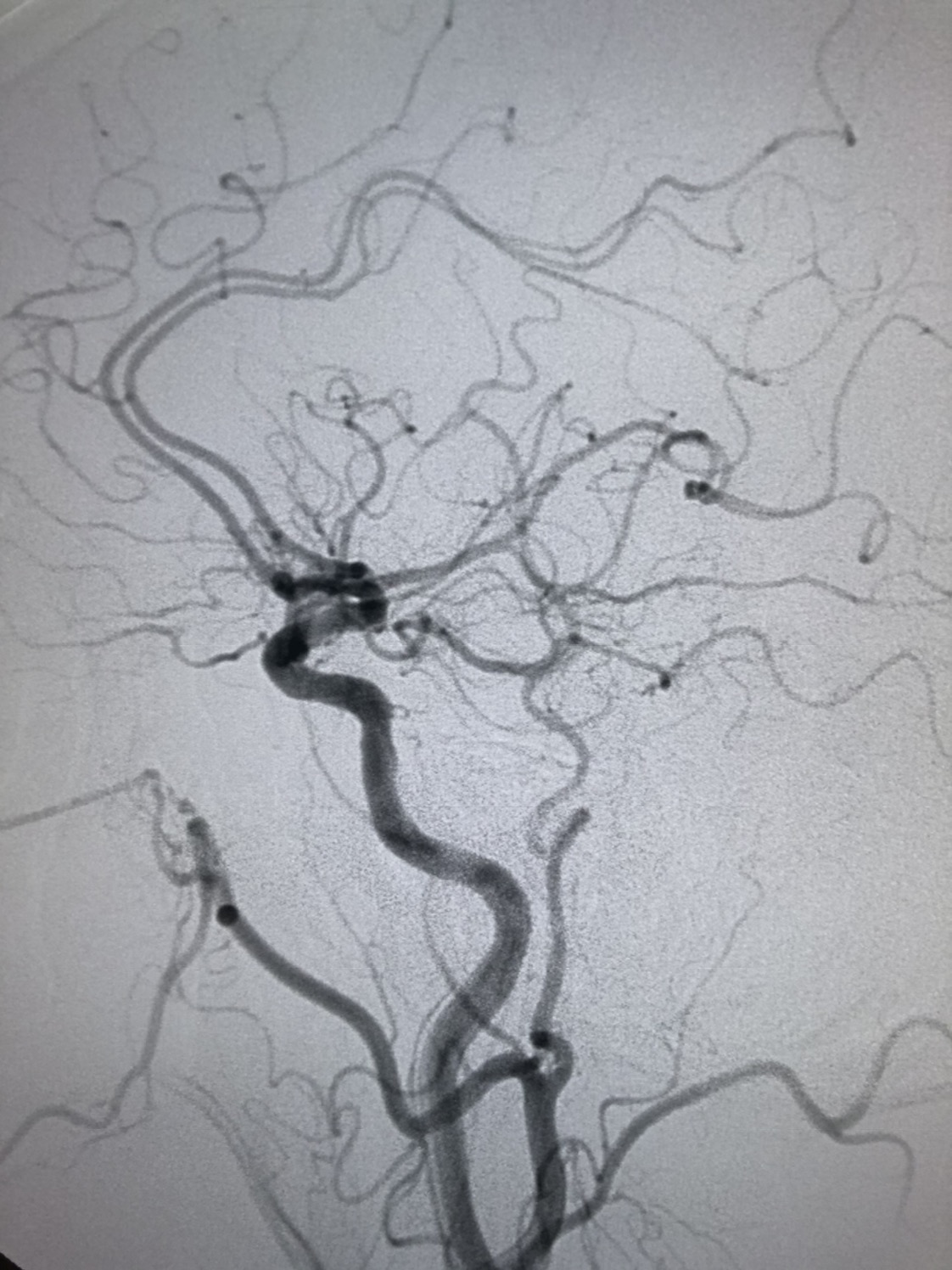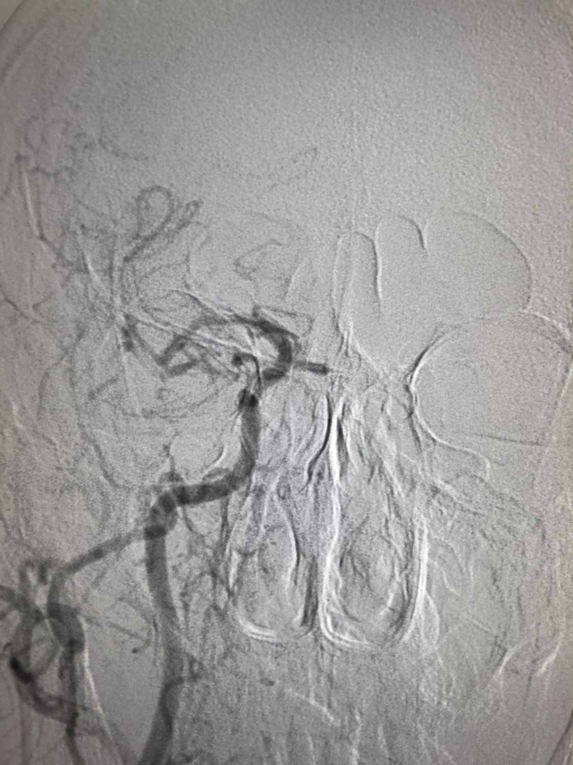 DSA:右侧颈内动脉窦部以远线性狭窄,窦部可见粥样硬化斑块,局部溃疡斑形成,动态可见造影剂滞留,颅内血管显影差。