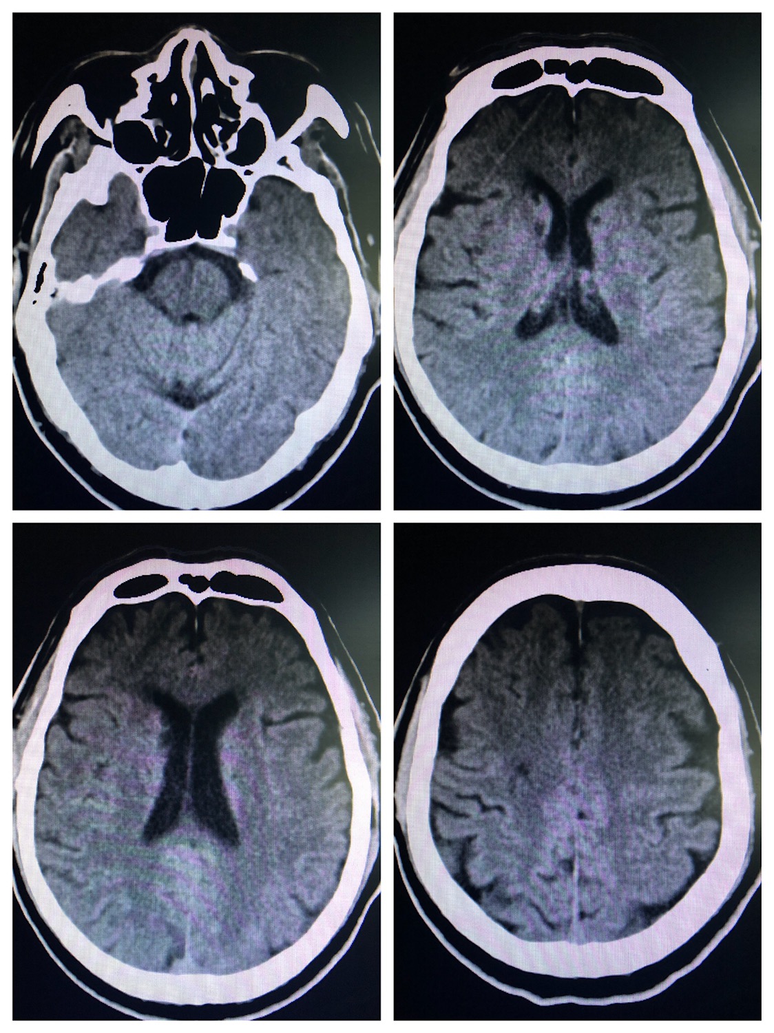 头CT示左侧小脑半球,右侧半卵圆中心及双侧基底节多发腔隙性脑梗死。