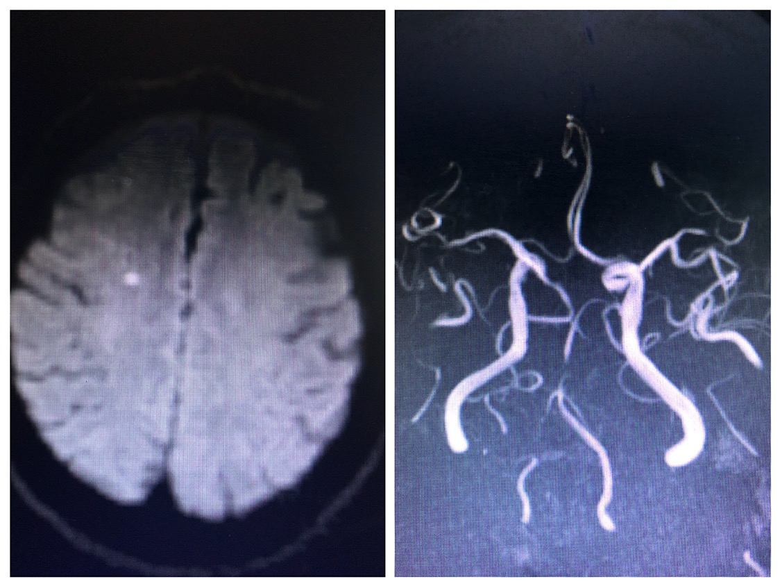 核磁示:右侧半卵圆中心新发腔隙性脑梗死,颅内多支血管狭窄,双侧胚胎型大脑后动脉。