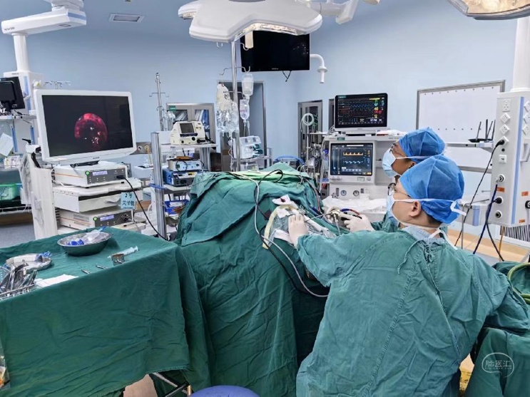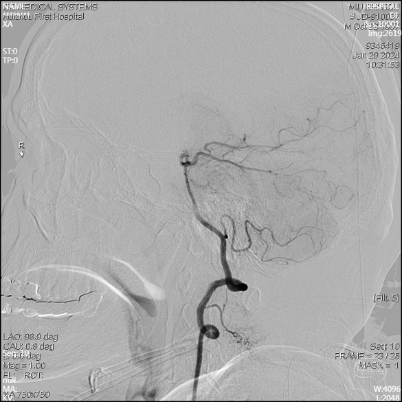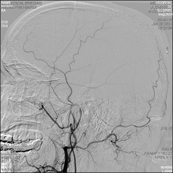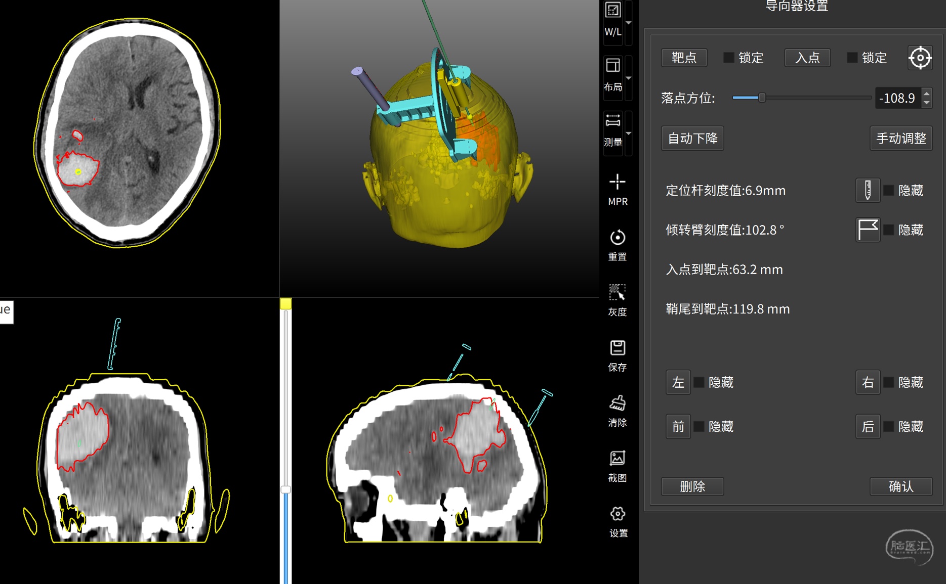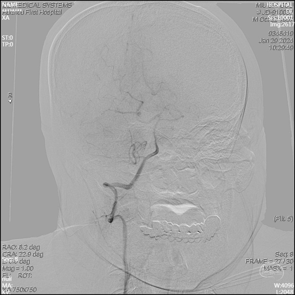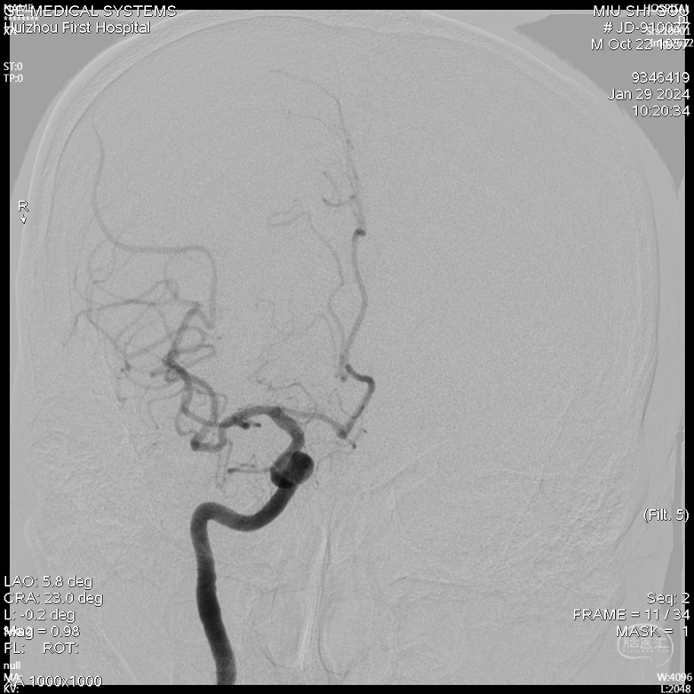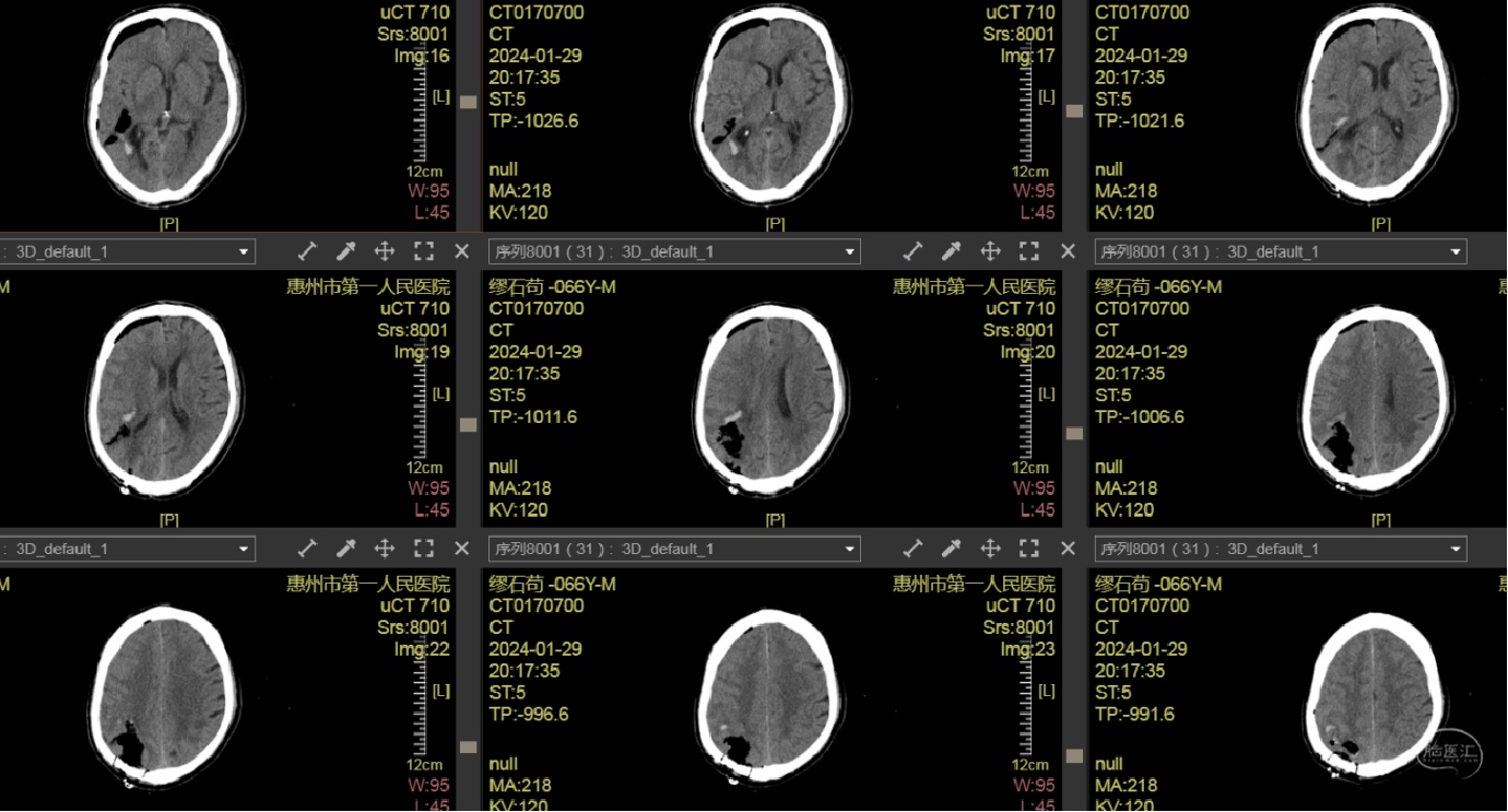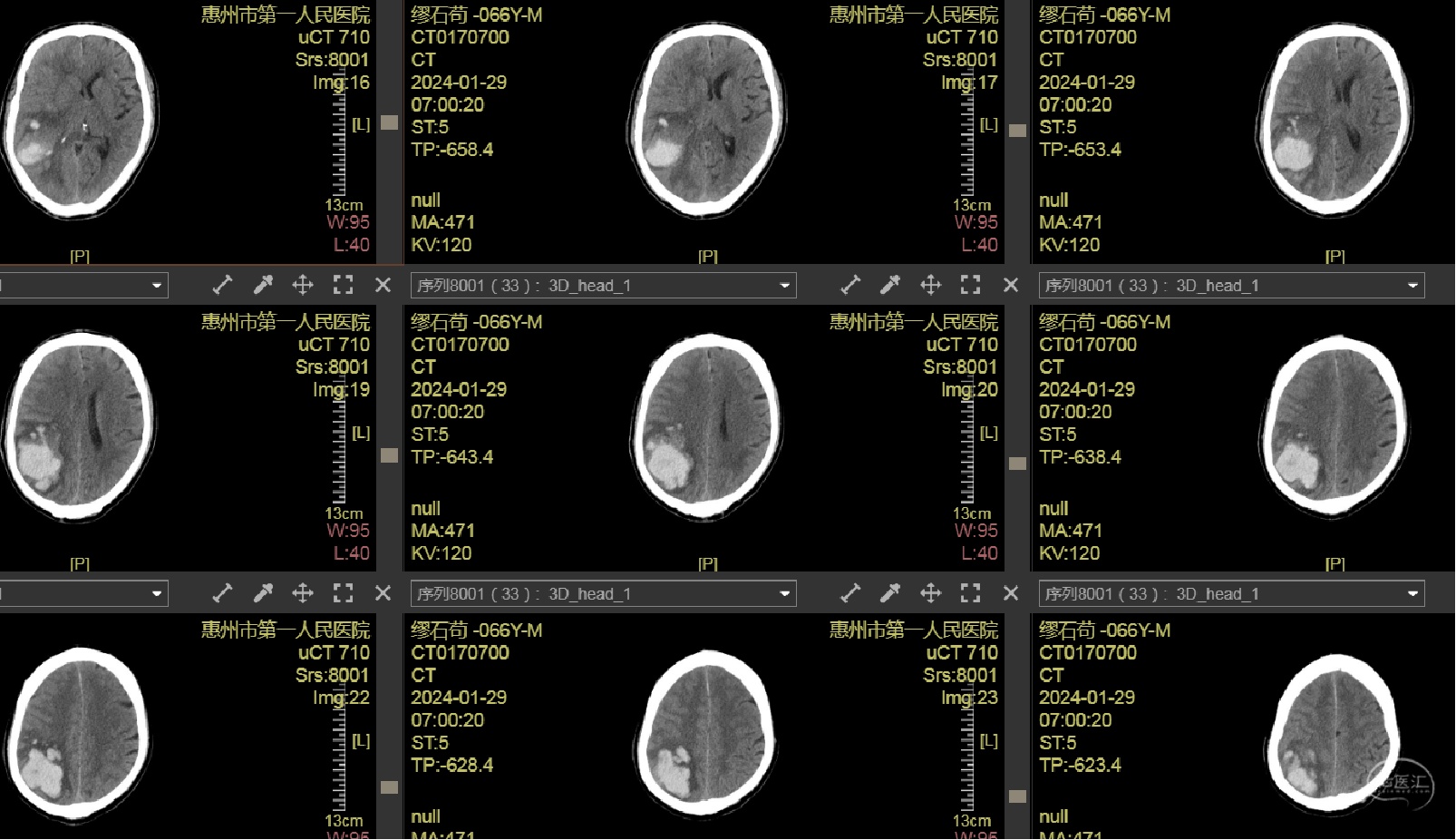 术前查体:嗜睡,对答切题,双眼左侧偏盲。右侧肢体肌力5级,左侧上肢肌力1级,左下肢肌力3级。左侧肢体深浅感觉消失。NIHSS评分:13分(视野3,左上肢4,左下肢2,感觉2,语言1,忽视1)。GCS:14分。