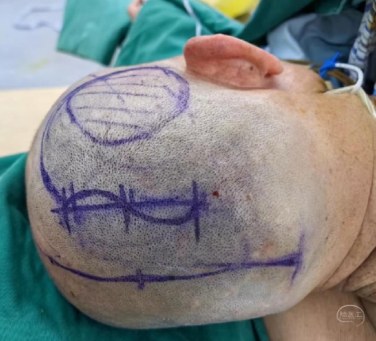 术前讨论:1、血肿量78ml,有明确手术指征,无手术禁忌;2、耳后马蹄瓣还是枕部入路?耳后马蹄瓣可以平卧位,体位摆放较容易,但是创伤大,清除部分血肿后皮质塌陷,容易血肿残留。枕部入路,需要公园长椅位,体位摆放时间长,依据长轴理念,神经内镜可以有效清除血肿,手术时间短,创伤小。