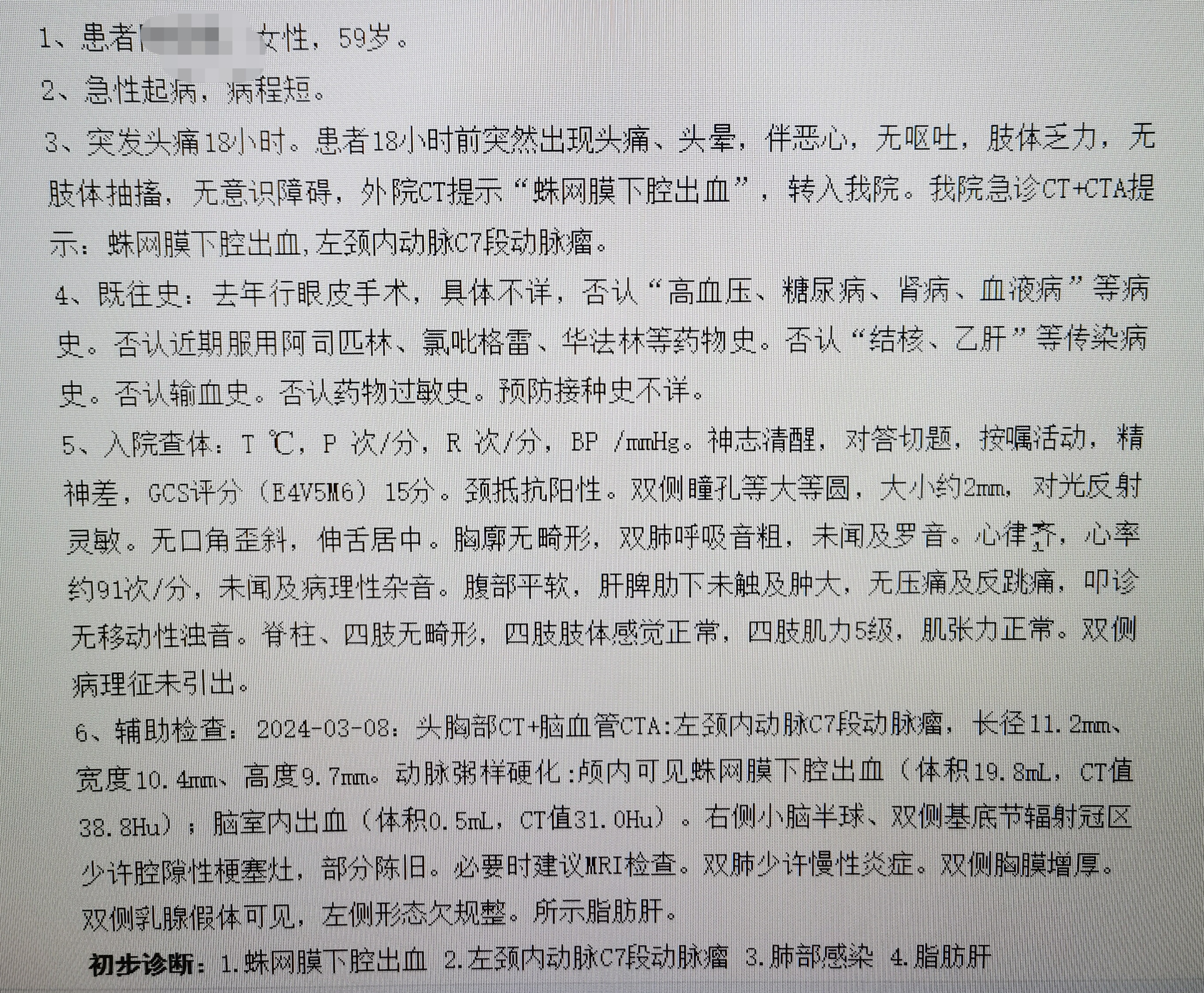 患者一般情况:老年女性,SAH入院,Hunt-Hess分级2级