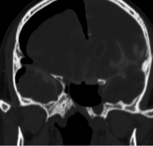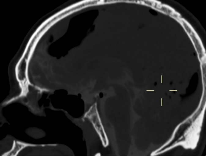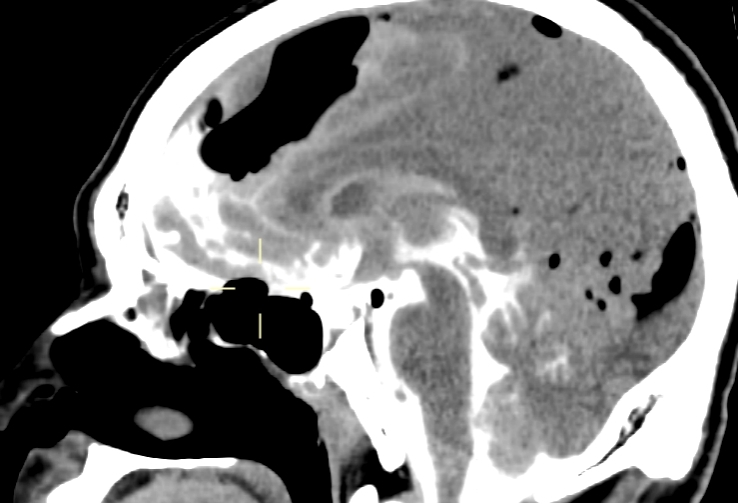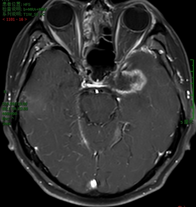 我院PET-CT检查显示鼻咽周围骨质改变,未见异常代谢增高,无肿瘤复发;左侧颞叶、左侧岛叶及左侧鞍旁片状低密度影,伴代谢稀疏,提示放射性坏死。脑室造影检查显示颅内积气,前颅底鞍结节颅骨缺损,脑脊液漏可能(图1-3)。MRI检查显示左侧颞叶内侧面不规则强化病灶,考虑放射性脑坏死改变(图4)。