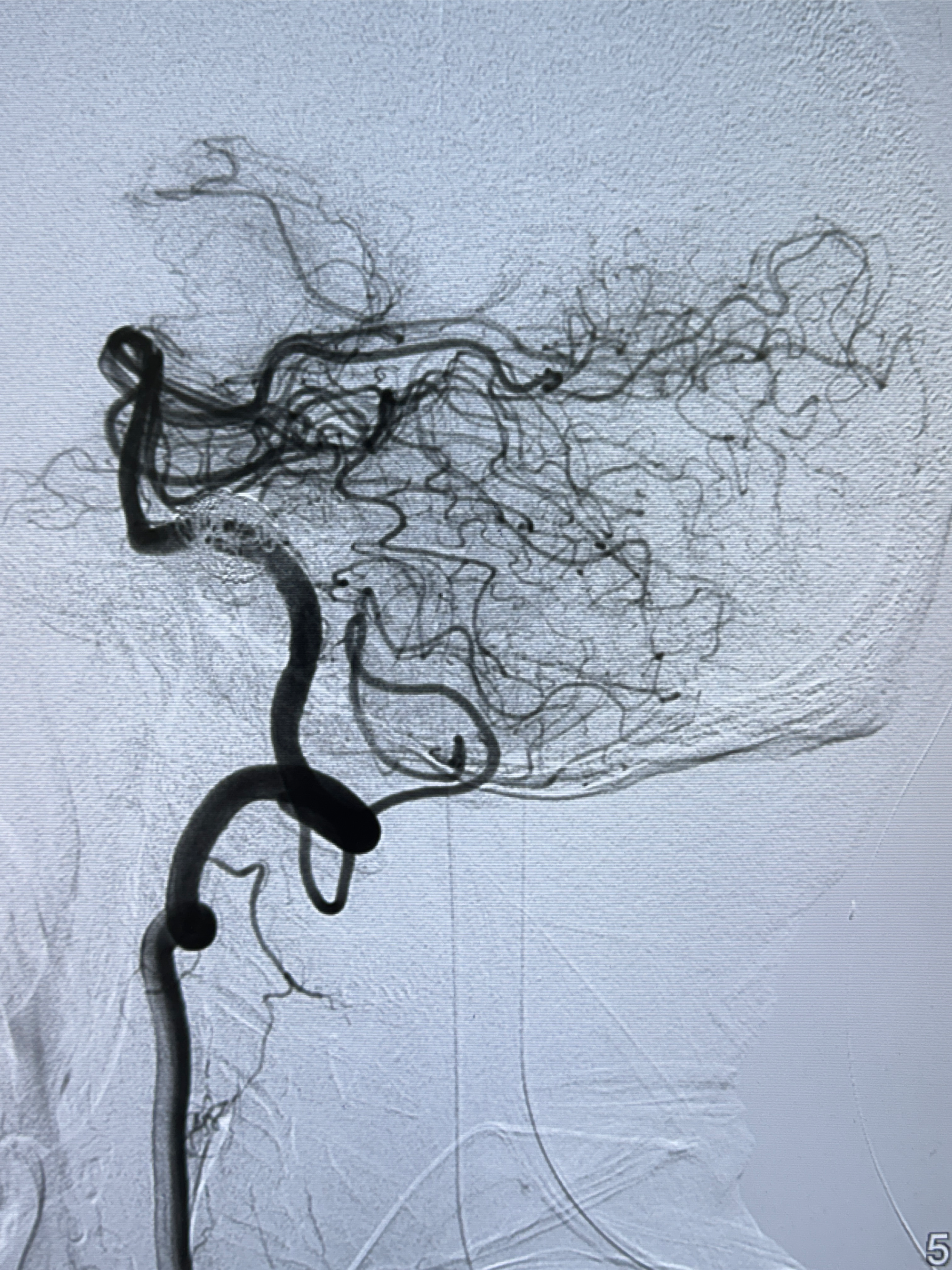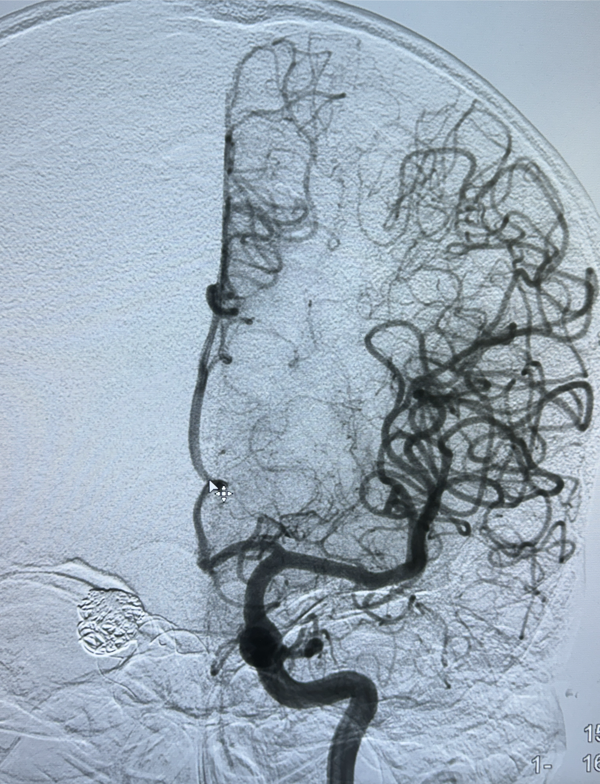 现病史:患者诉2022.06.24因“检查发现颅内动脉瘤”就诊于华山医院查全脑血管造影诊断右侧椎动脉夹层动脉瘤(14.86*12.02mm),随后在全麻下行支架辅助栓塞术(LEO,本人诉2枚支架),术顺,术后予以阿司匹林、氯吡格雷、阿托伐他汀钙片对症治疗;术后3月因下肢淤青停用氯吡格雷,患者近2月开始出现发作性右侧枕部隐痛不适,持续时间约几分钟,着凉可诱发,余一般情况可,目前服用阿司匹林1片qd治疗中,为复查脑血管造影收入我科。