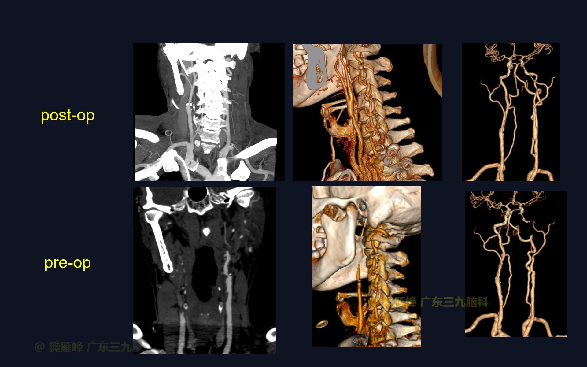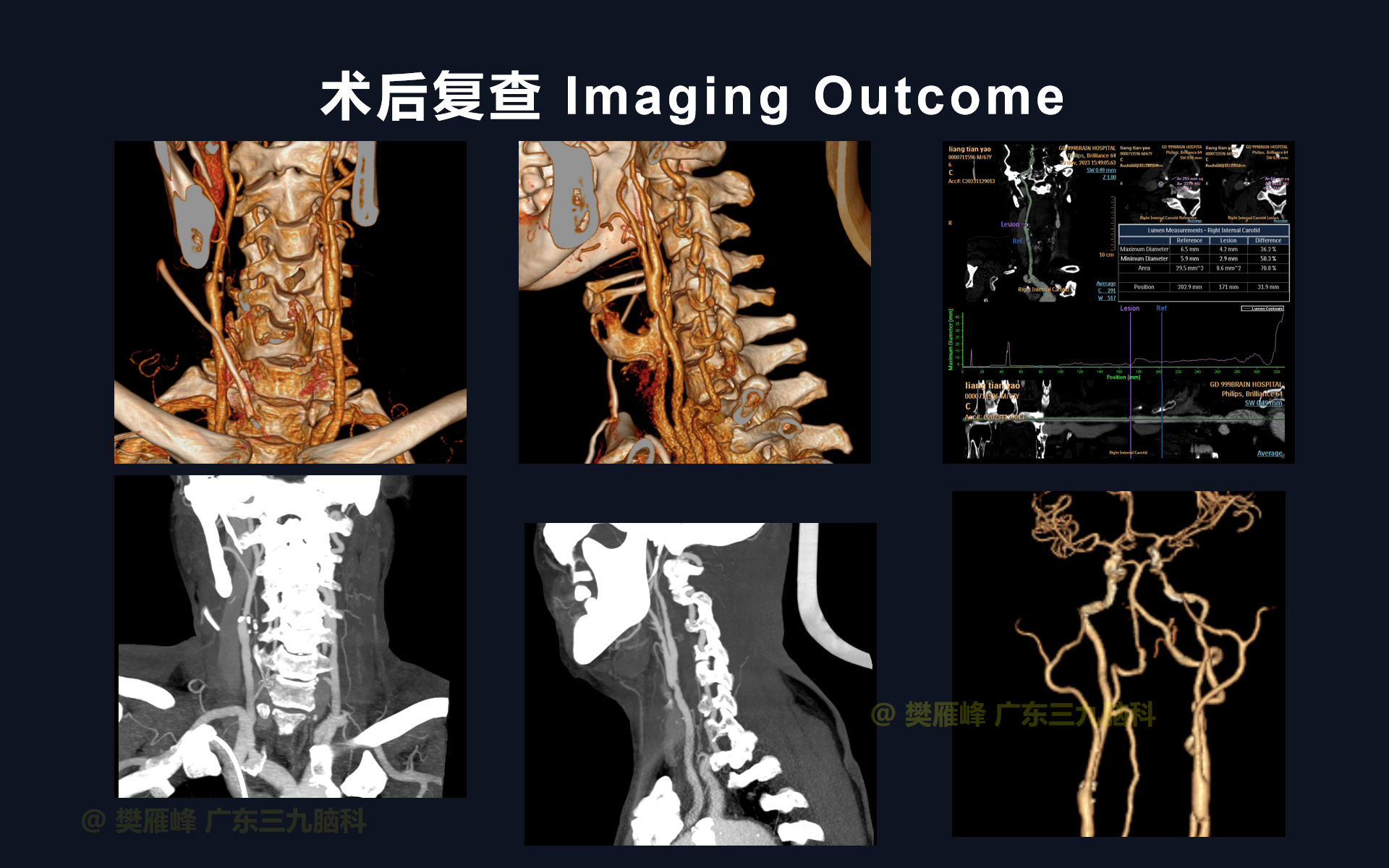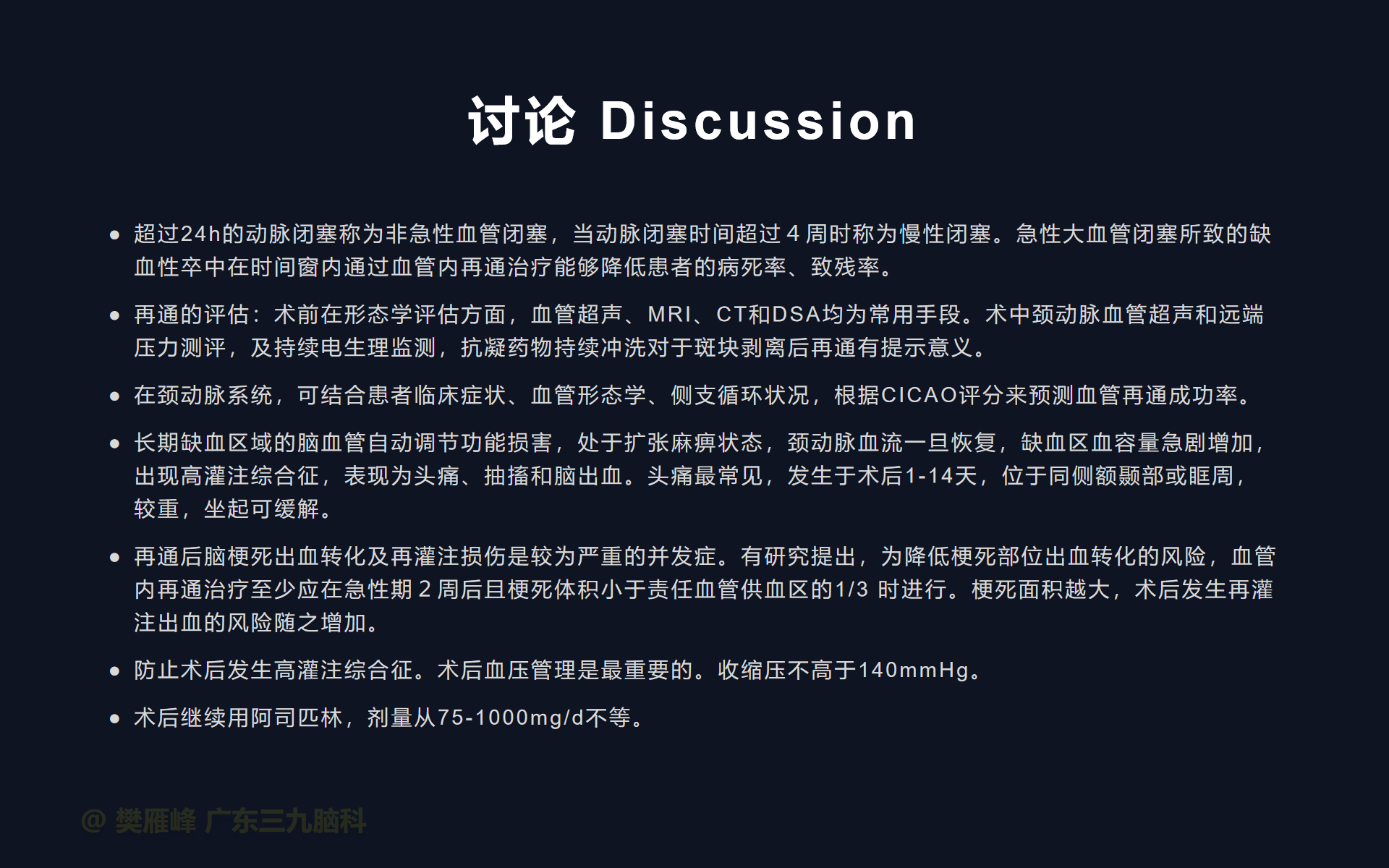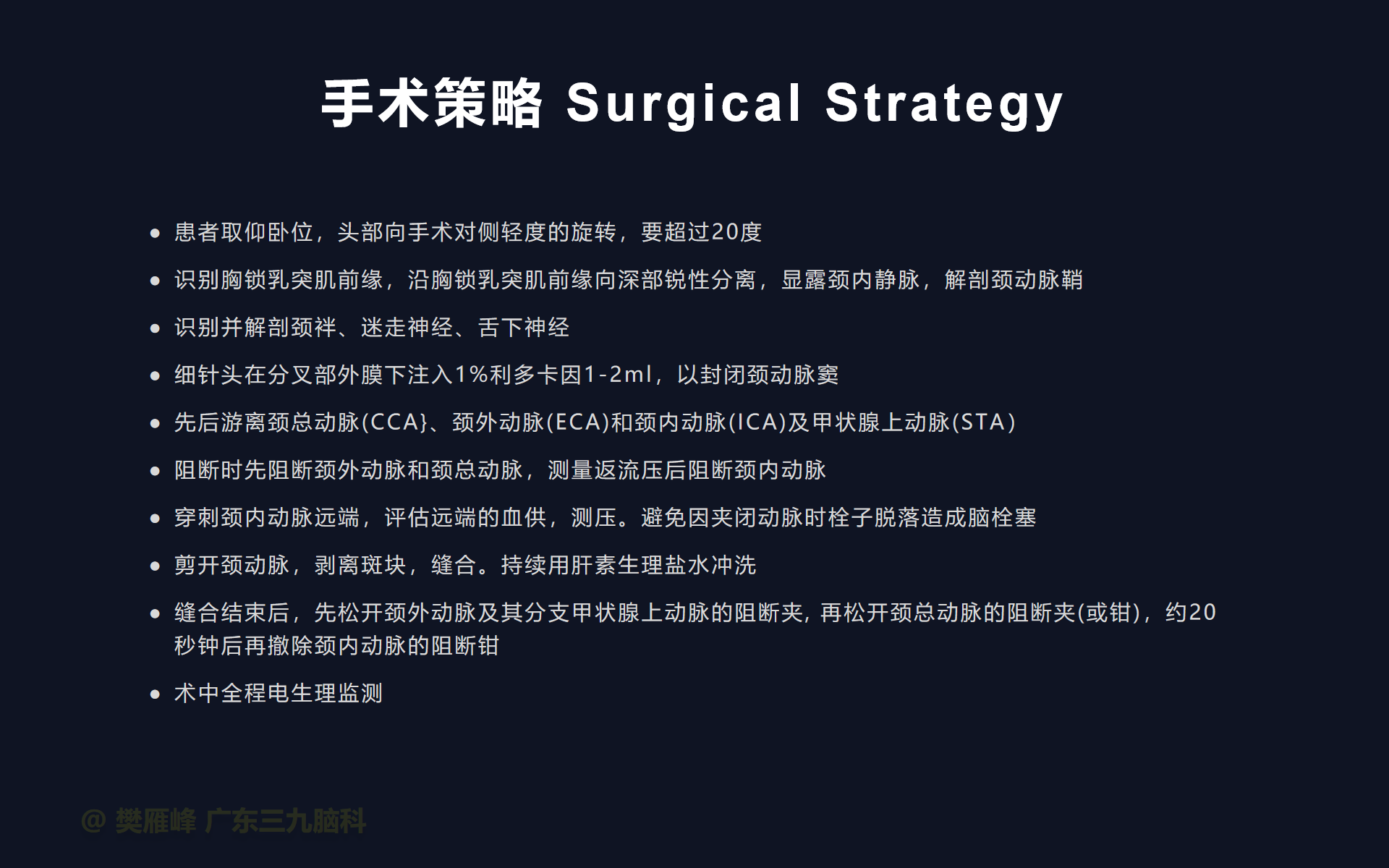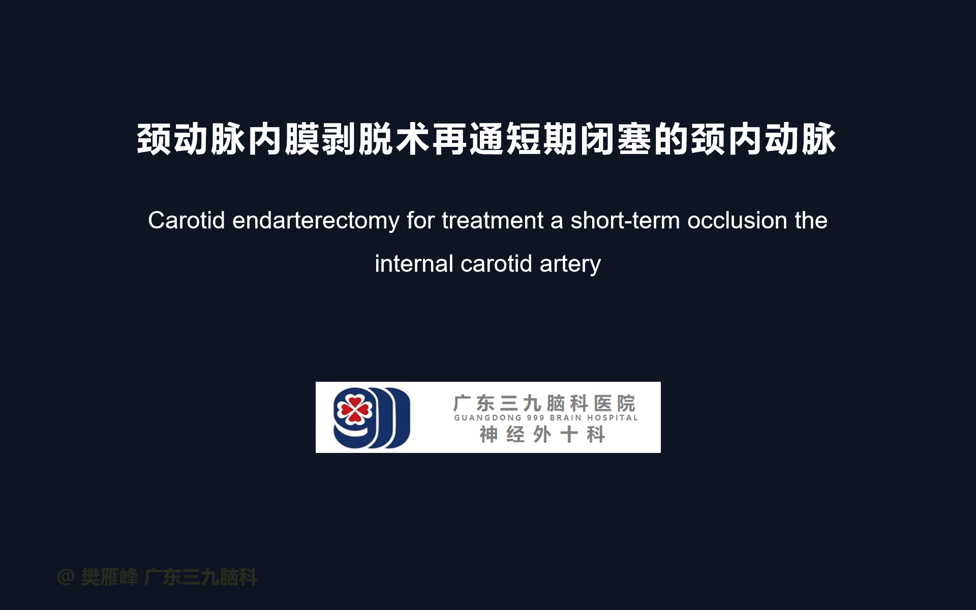 在这个二维手术视频中,展示了一种颈动脉内膜剥脱术开通短期闭塞的颈内动脉的方法。患者是一名67岁的男性,有3月的右侧肢体乏力伴有言语不清,头颅CTA示:左侧颈总动脉上段管腔局限性狭窄(狭窄度约为63%);右侧颈内动脉起始部管壁混合性斑块形成(狭窄度约为70.8%)给双抗血小板保守治疗,3月后复查头颅DSA示左侧颈内动脉闭塞。经术前充分评估,他接受了颈动脉内膜剥脱术,术中穿刺颈内动脉远端有回血,压力不高,在电生理监测下行颈内动脉和颈外动脉内膜剥脱,术中造影均通畅。术后未出现脑梗死和高灌注损伤。术后神经影像学显示血管血流通畅,脑灌注改善。我们展示了颈动脉内膜剥脱术开通短期闭塞的颈内动脉技术要点,及精准的围手术期管理办法。