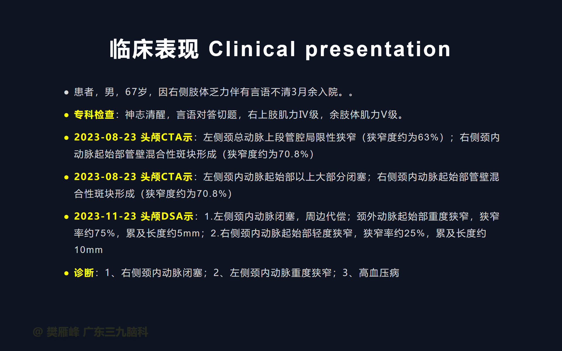 在这段手术视频中,展示了一名67岁男性的病例,他因右侧肢体乏力伴有言语不清3月余发现的右侧颈内动脉闭塞。