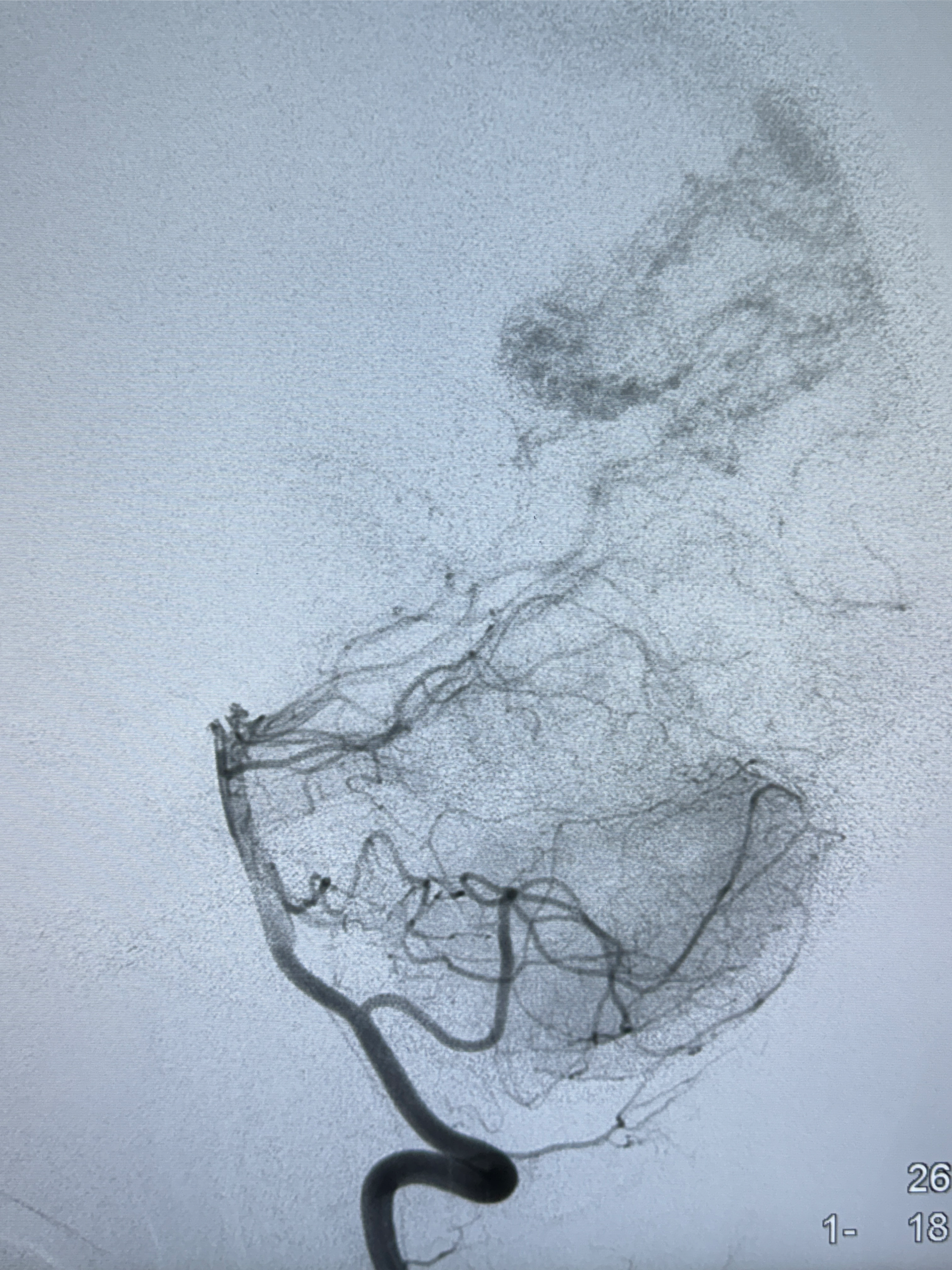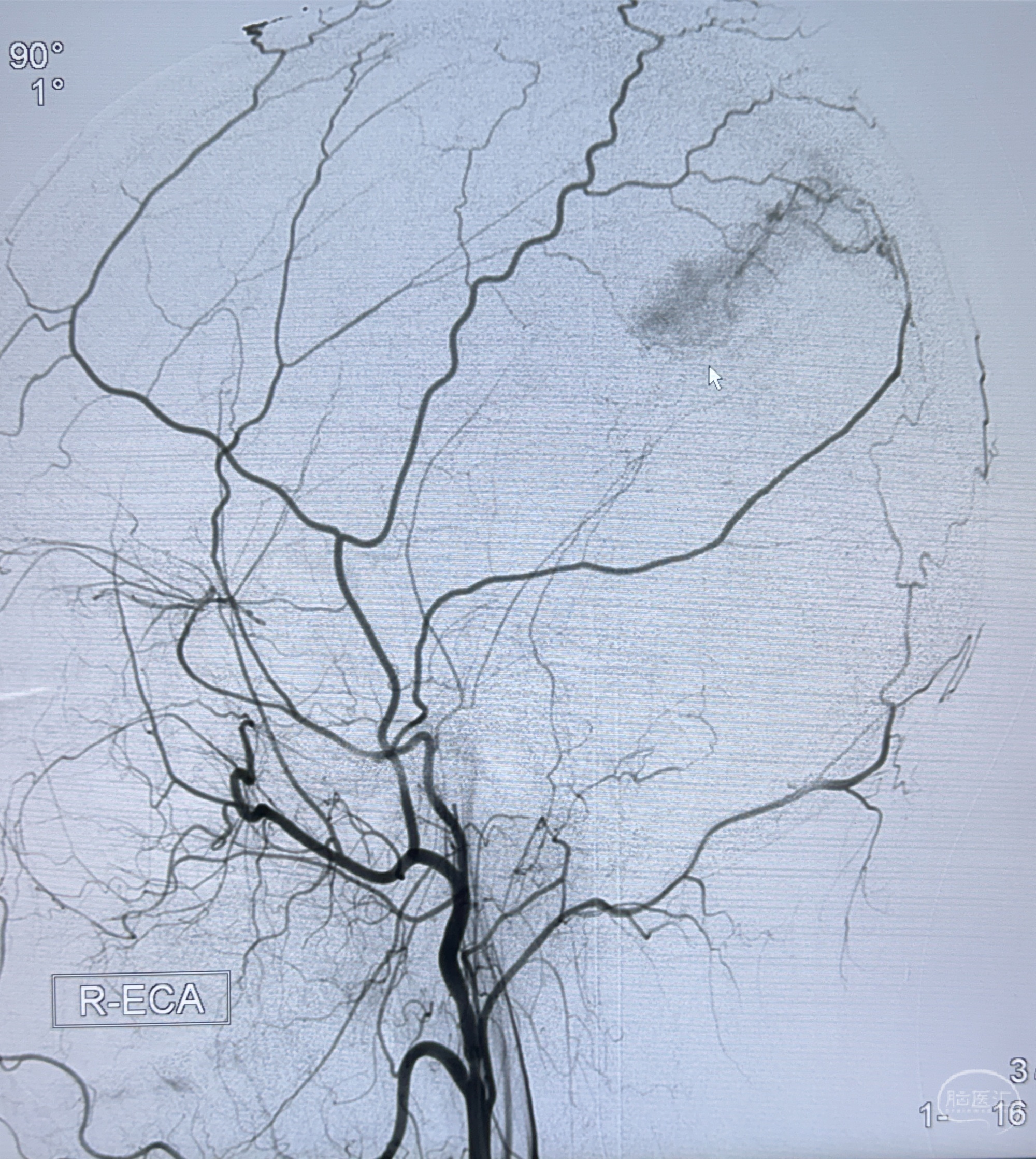 2024-01-29DSA:右侧额顶叶脑膜脑动静脉血管畸形,供血动脉为右侧大脑中动脉、大脑前动脉、右侧脑膜中动脉岩鳞支及大脑后动脉分支,向上矢状窦引流