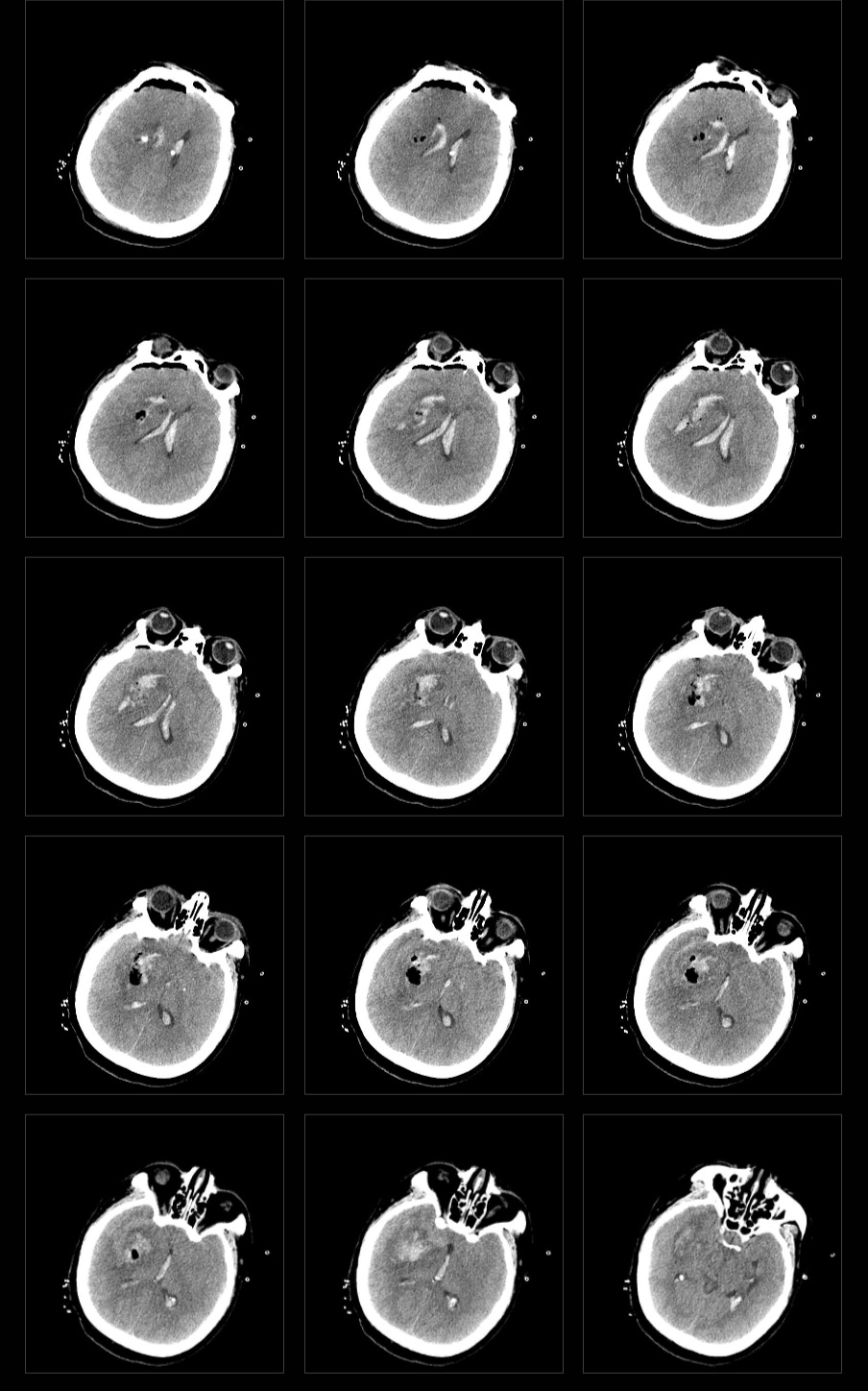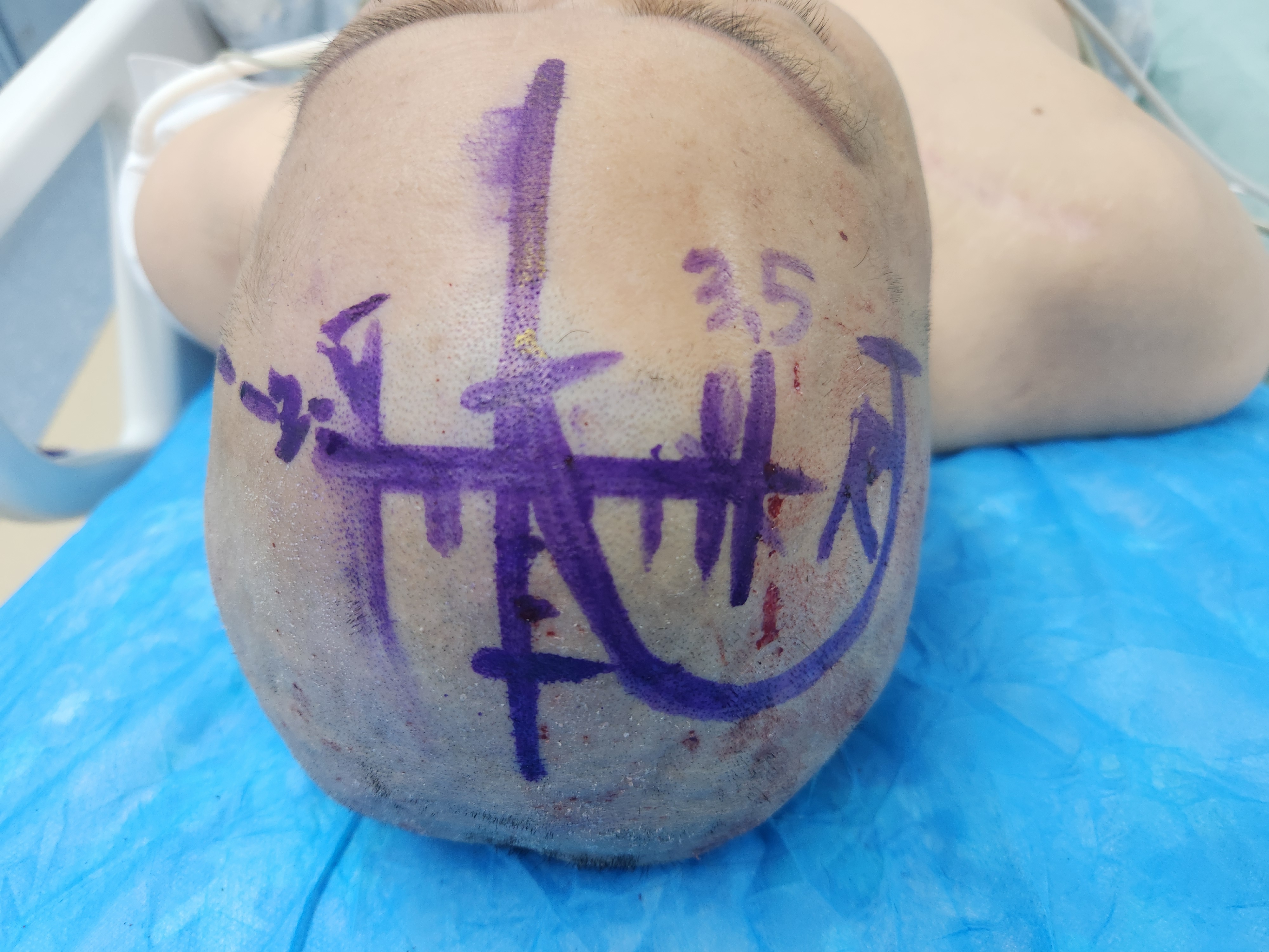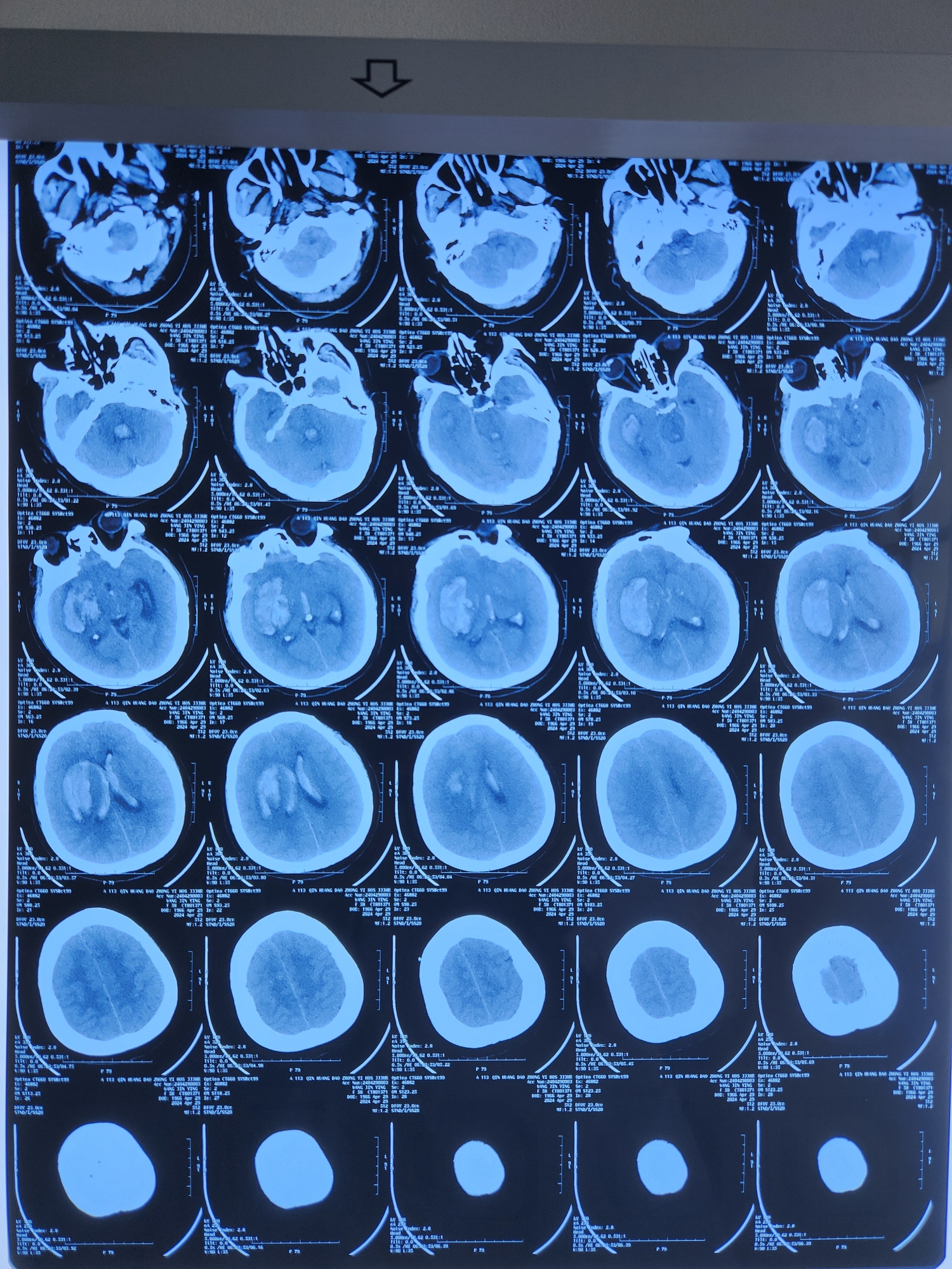 进修结束上班马上两个月了,终于等到一个脑出血手术,真是等到花儿都谢了……😞😞😞 患者为中年女性,突发意识不清入院,外院CT提示右侧基底节出血破入脑室。查体:神志昏迷,刺痛不睁眼,不发声。双侧瞳孔正大等圆,光反应存在。左侧肢体刺痛不动,右侧肢体刺痛屈曲。右侧巴氏征阳性。GCS:E1V1M4=6分 术前CT 手术切口设计 骨窗中心位于中线旁开3.5cm冠状缝前2.5cm 术中因为考虑到止血问题,没有继续清除脑室内的血肿……好久不用内镜手术确实有点生疏了…… 术后CT 术后查体:神志昏迷,刺痛不睁眼,保留气管插管。双侧瞳孔正大等圆,光反应存在。左侧肢体刺痛屈曲,右侧肢体刺痛定位。右侧巴氏征阳性。术后第三日患者呼唤睁眼,拔出气管插管后可简单对答,右侧肢体遵嘱活动。GCS:E3V4M5=12分希望病人能有良好的预后🙏🏻