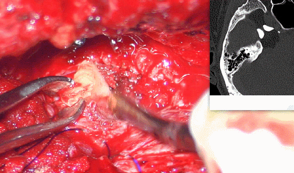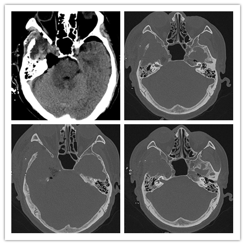 辅查:颅脑MRI:右侧CPA-中颅底占位,考虑良性肿瘤。头颅CT提示:中颅窝右份混杂密度病变,部分骨质缺损,考虑畸胎瘤、脂肪瘤等。