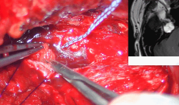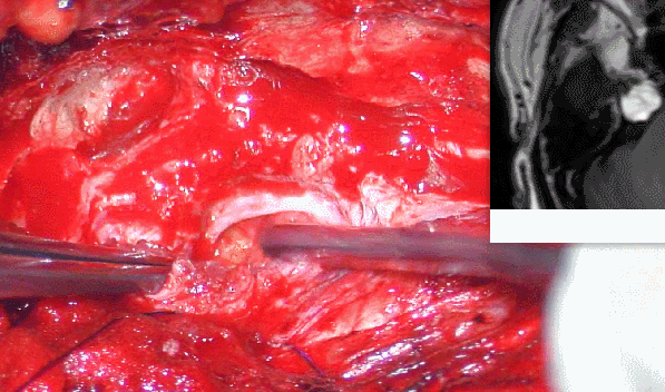 3.肿瘤位于海绵窦内,卵圆孔-破裂孔区,为颅底孔道结构改变,采用前颞下经中颅窝入路,进入海绵窦区,术中避免损伤相关结构。