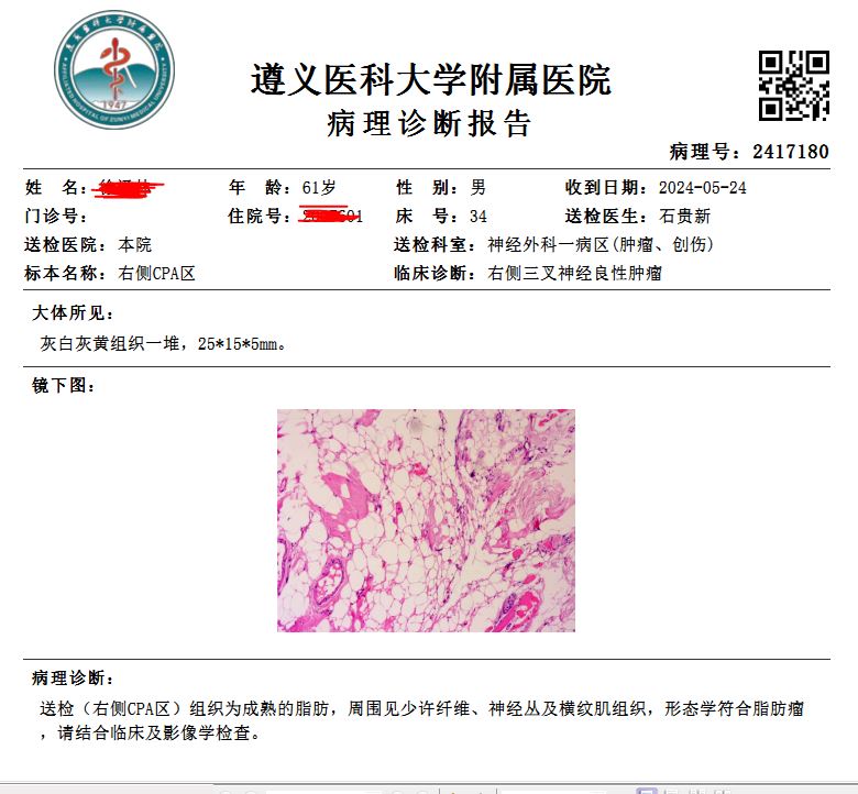 现病史:患者3年前无明显诱因出现右侧颜面部疼痛,以右侧口唇周围明显,疼痛呈阵发性,双眼活动不受限。无重影、视物旋转,无恶心、呕吐,无意识障碍、四肢抽搐等。期间就诊于外院,未予特殊处理,后就诊于当地医院行MRI后提示三叉神经肿瘤。今再次就诊于我院门诊,门诊以“右侧三叉神经良性肿瘤”收入我科,病来患者精神、饮食尚可,二便正常,近期体重无明显增减。