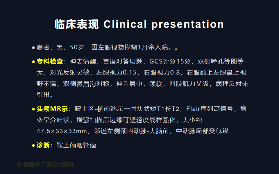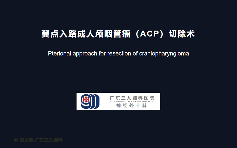 在这个二维手术视频中,展示了一种经翼点入路颅咽管瘤。患者是一名50岁的男性,有1月的左眼视物模糊、无多饮多尿病史,神经影像学显示鞍上区-桥前池示一团块状短T1长T2,Flair序列高信号,分叶状,边缘轻度线样强化,大小约47.5×33×33mm,邻近左侧颈内动脉-大脑前、中动脉局部受包绕的鞍上的颅咽管瘤。经术前讨论选择经扩大翼点入路颅咽管瘤切除,以实现肿瘤全切除,保护周围神经血管。术后术后尿量增多,10天后好转;视力、视野同术前改变;神经影像学显示肿瘤全部切除。我们展示了安全的神经血管保护和肿瘤切除术的细微差别和技术要点,以及手术技术。