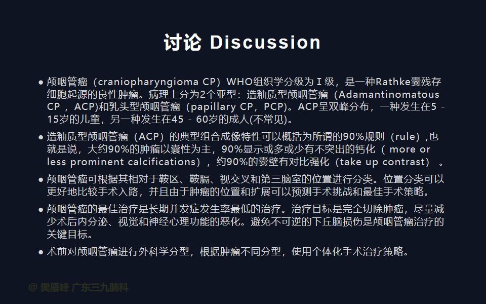 颅咽管瘤(craniopharyngioma CP)WHO组织学分级为Ⅰ级,是一种Rathke囊残存细胞起源的良性肿瘤。病理上分为2个亚型:造釉质型颅咽管瘤(Adamantinomatous CP ,ACP)和乳头型颅咽管瘤(papillary CP,PCP)。ACP呈双峰分布,一种发生在5 - 15岁的儿童,另一种发生在45 - 60岁的成人(不常见)。