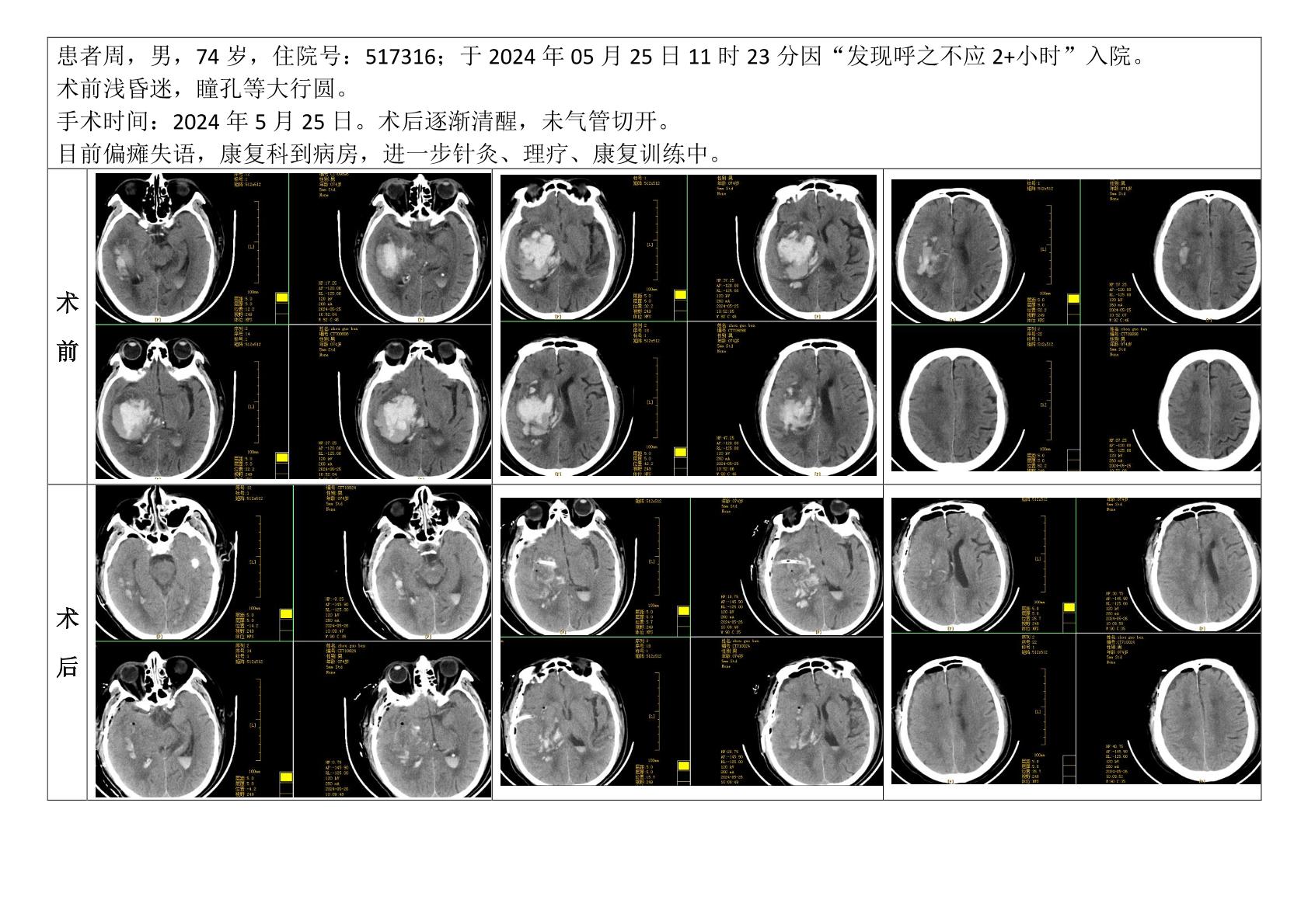 患者周某某,男,74岁,住院号:517316;于2024年05月25日11时23分因“发现呼之不应2+小时”入院。