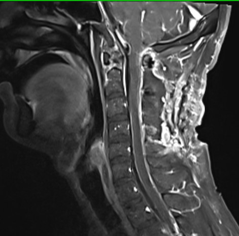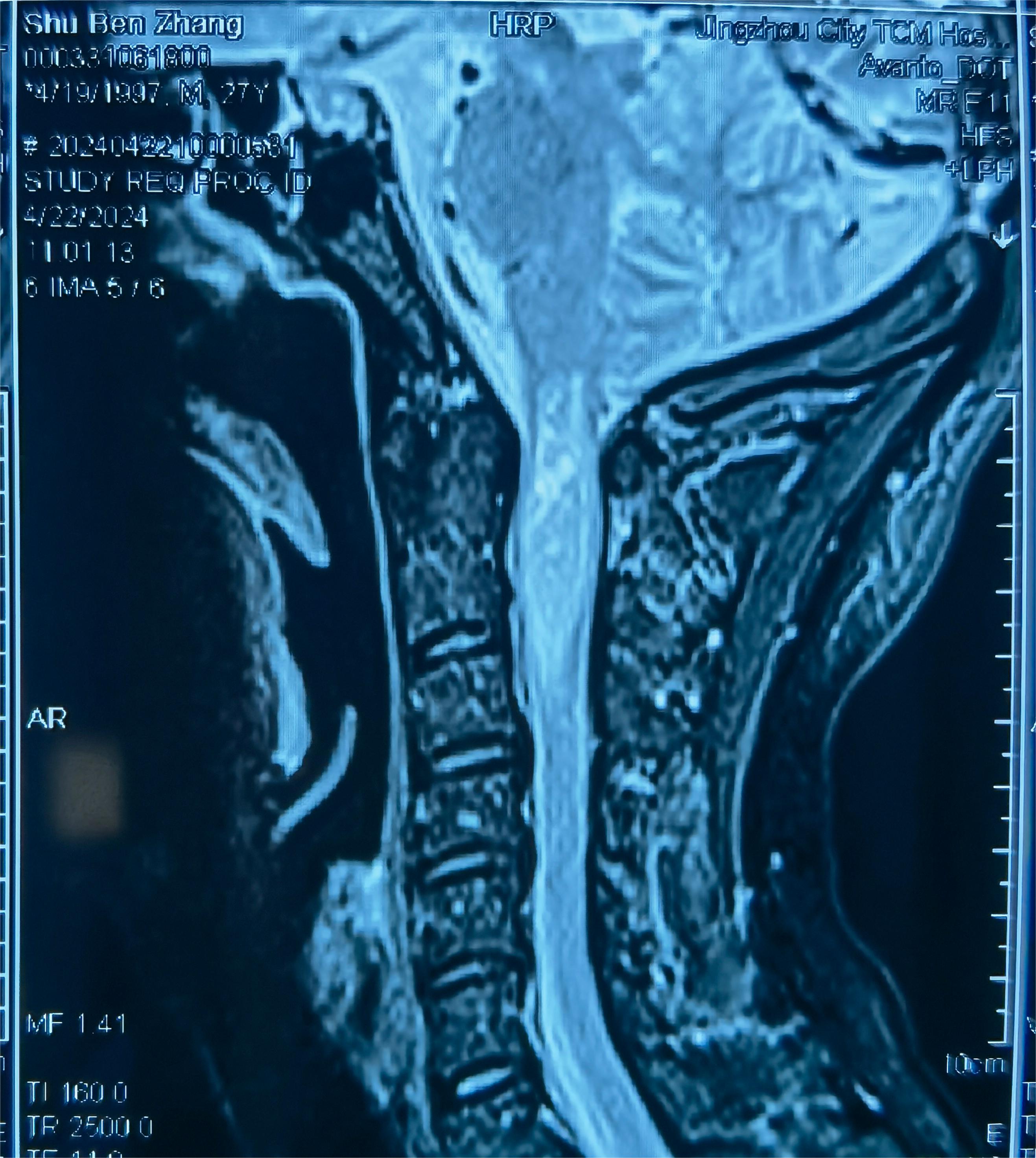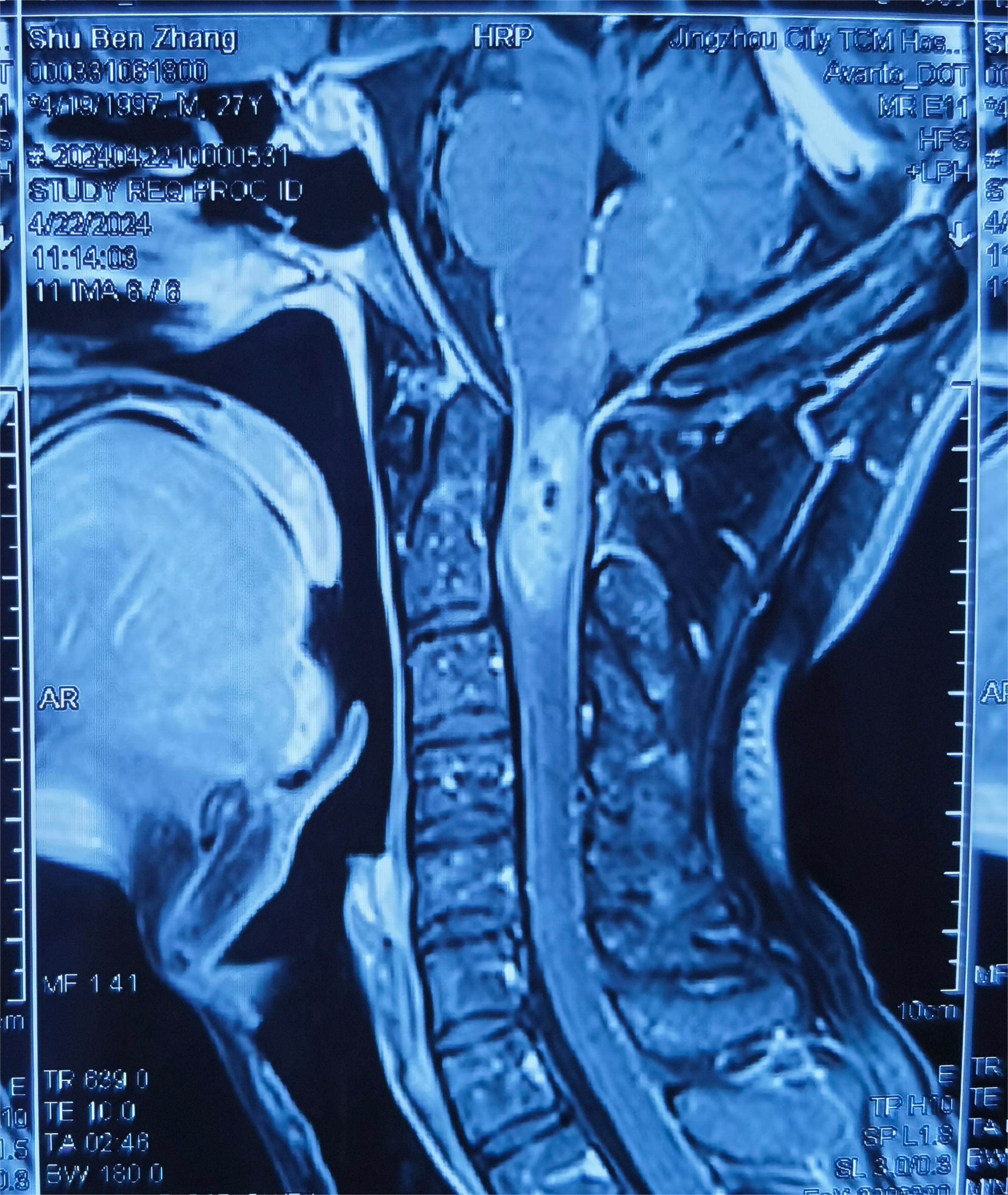 患者男性,27岁,发现颈髓占位一年,加重伴肢体无力,呼吸困难1月入院