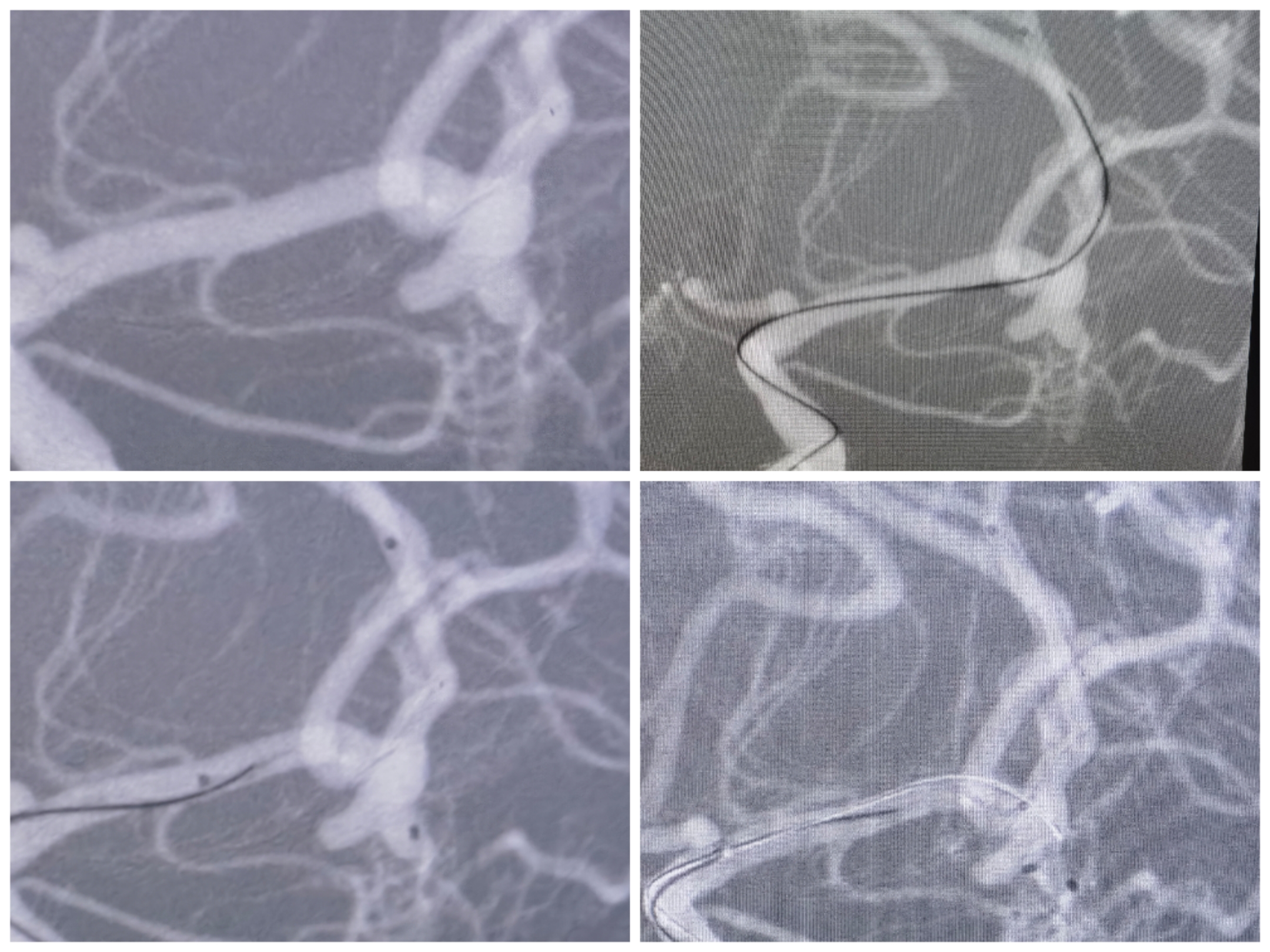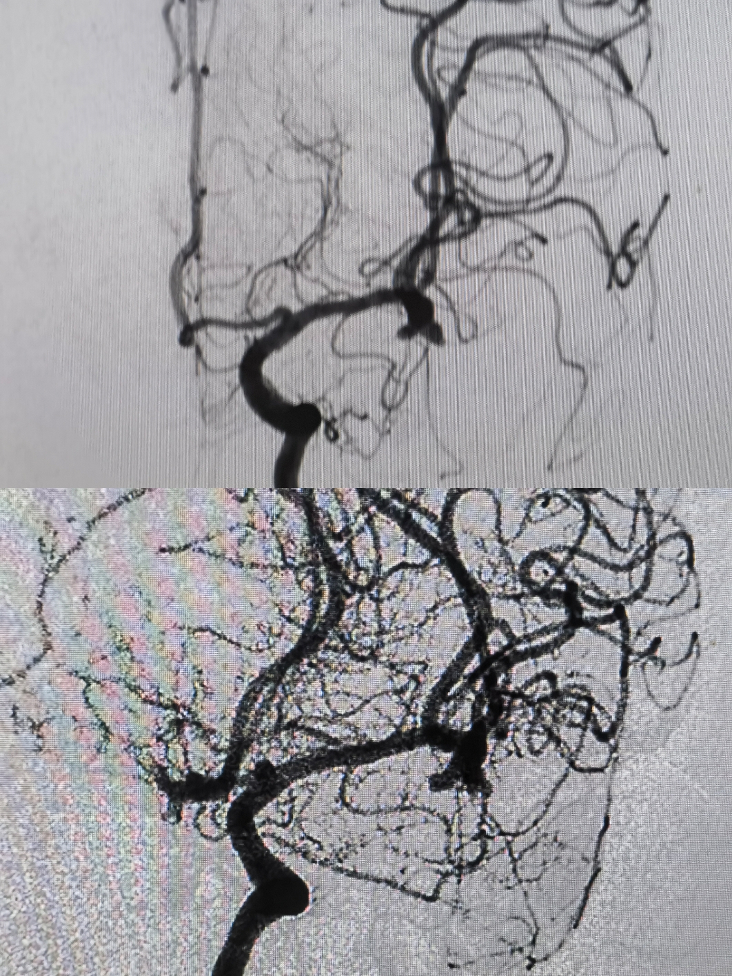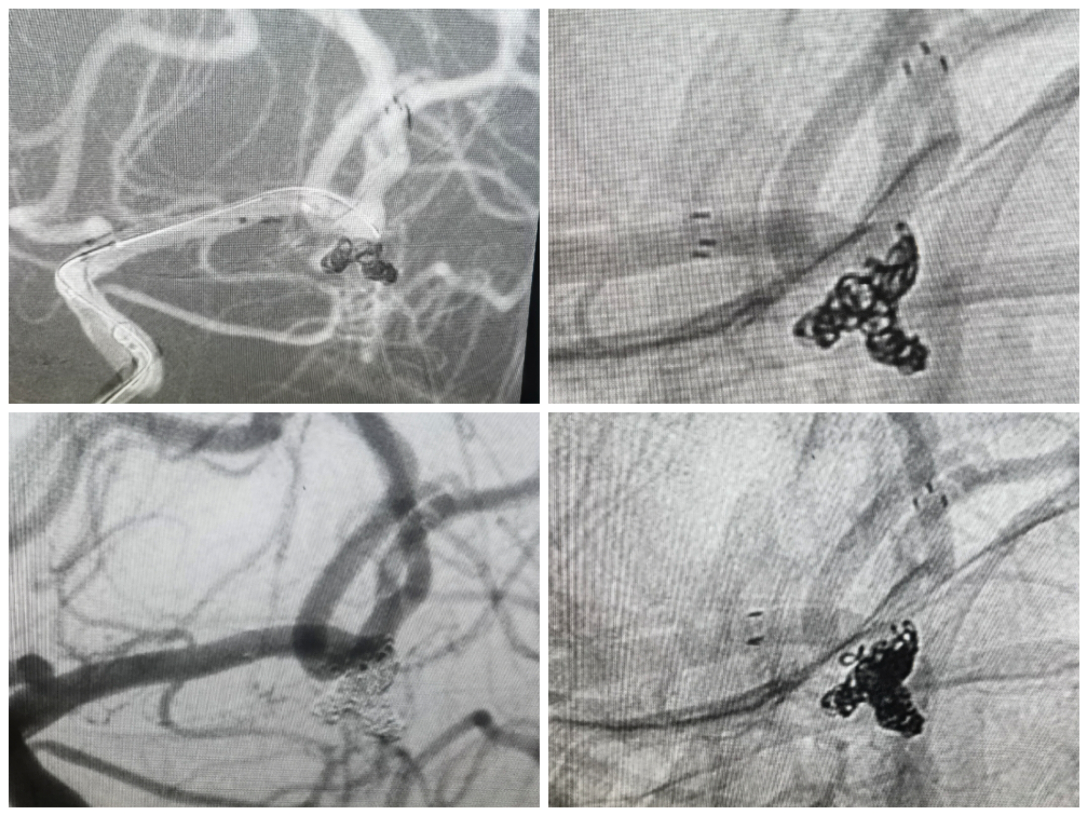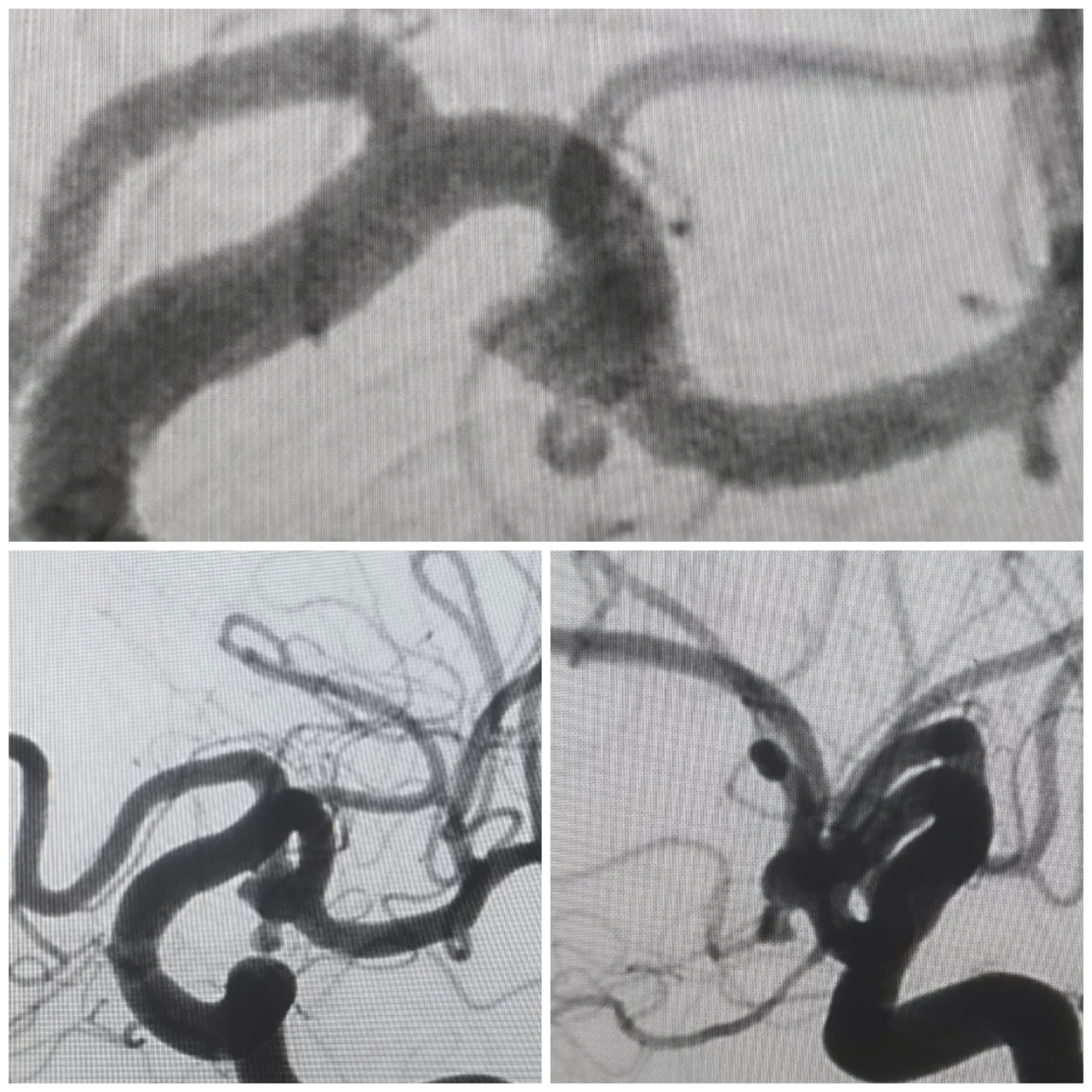 手术过程微导管布局情况:三系统栓塞,支架导管置于上干,两条微导管分别置于主囊和子囊中。