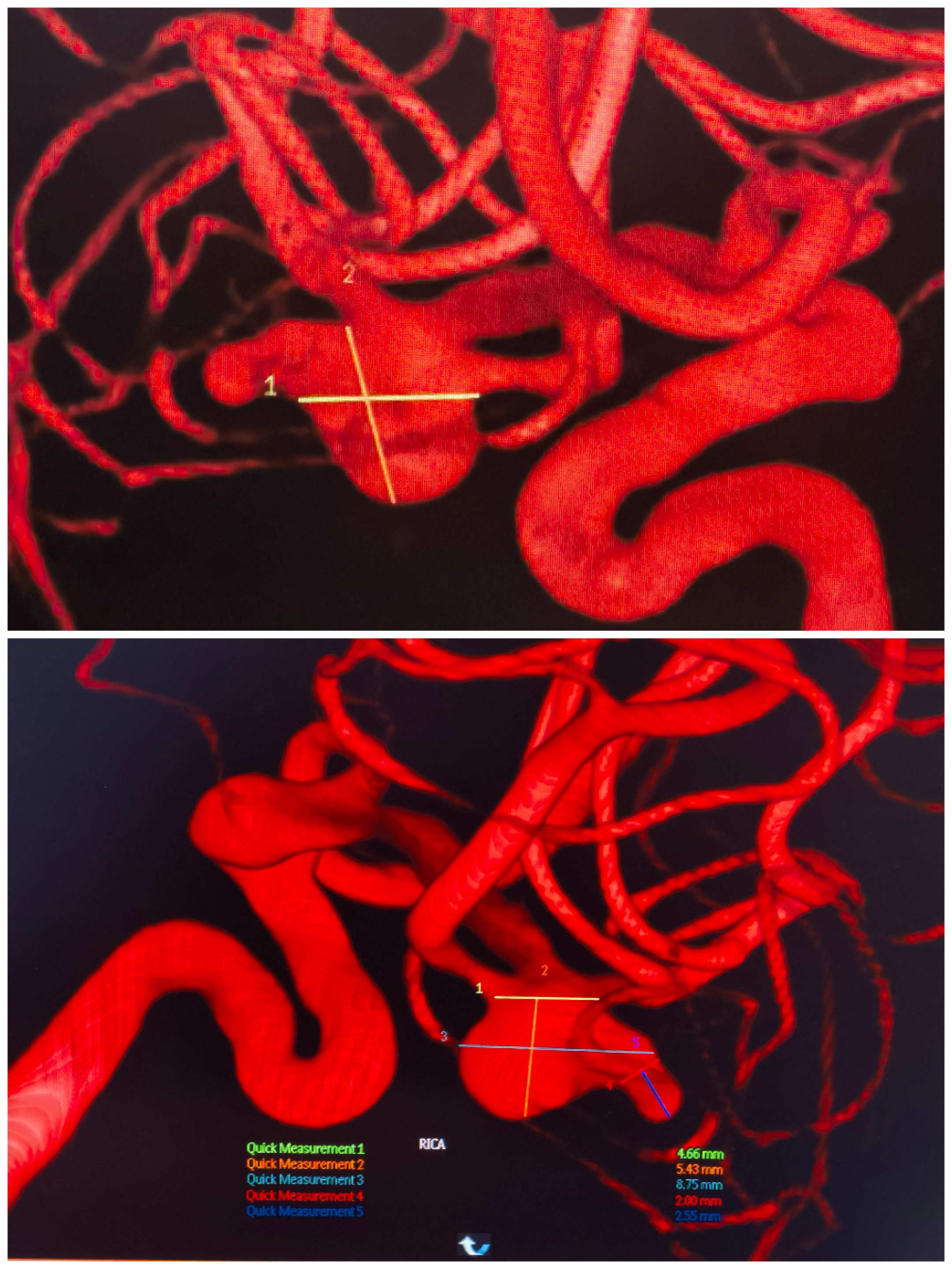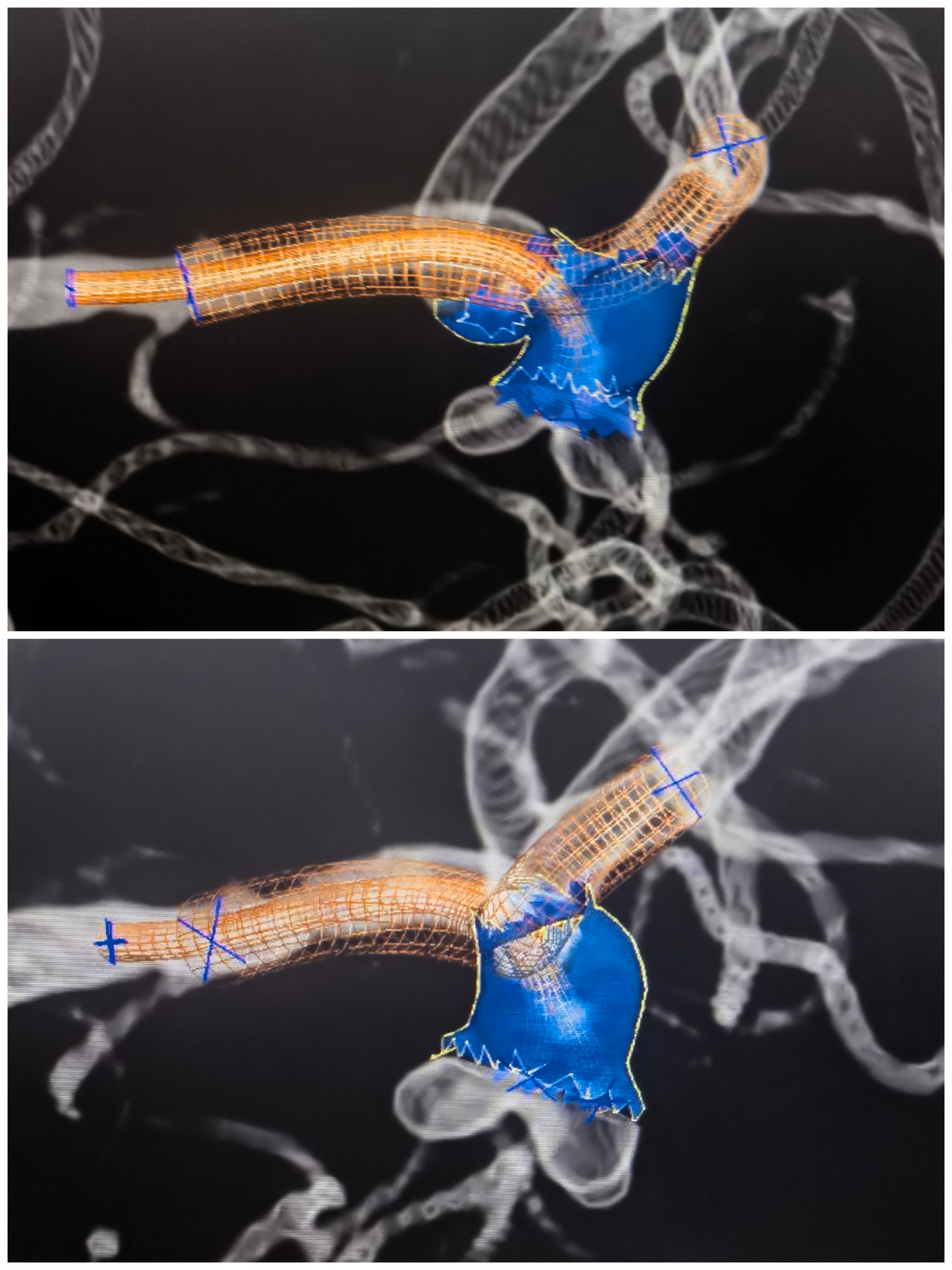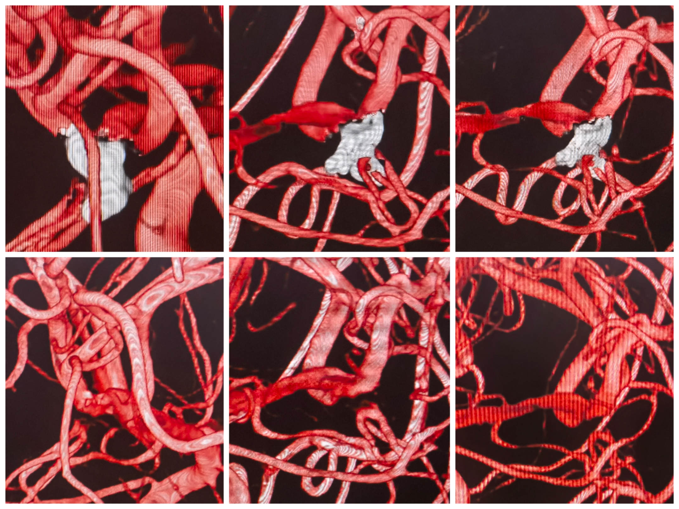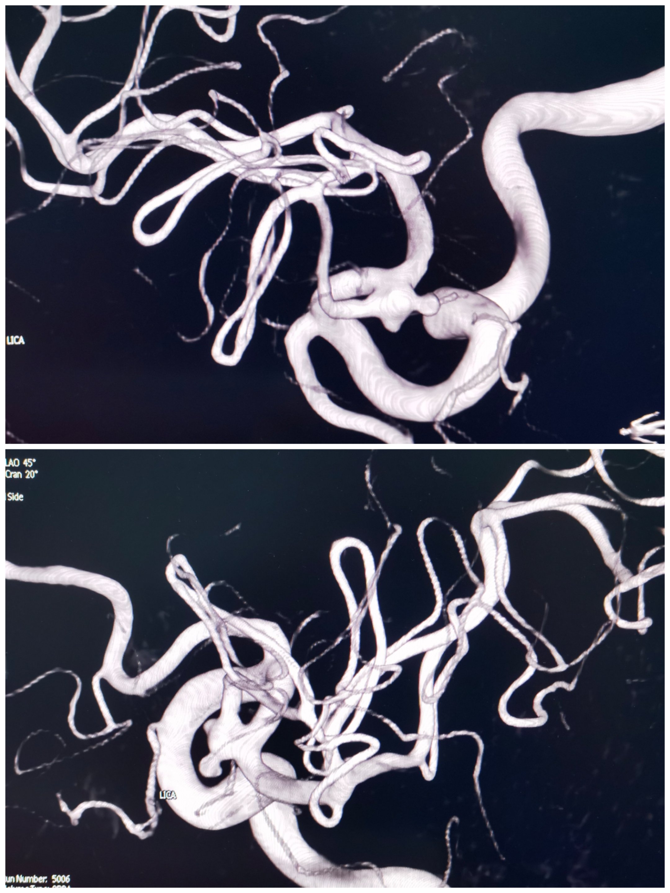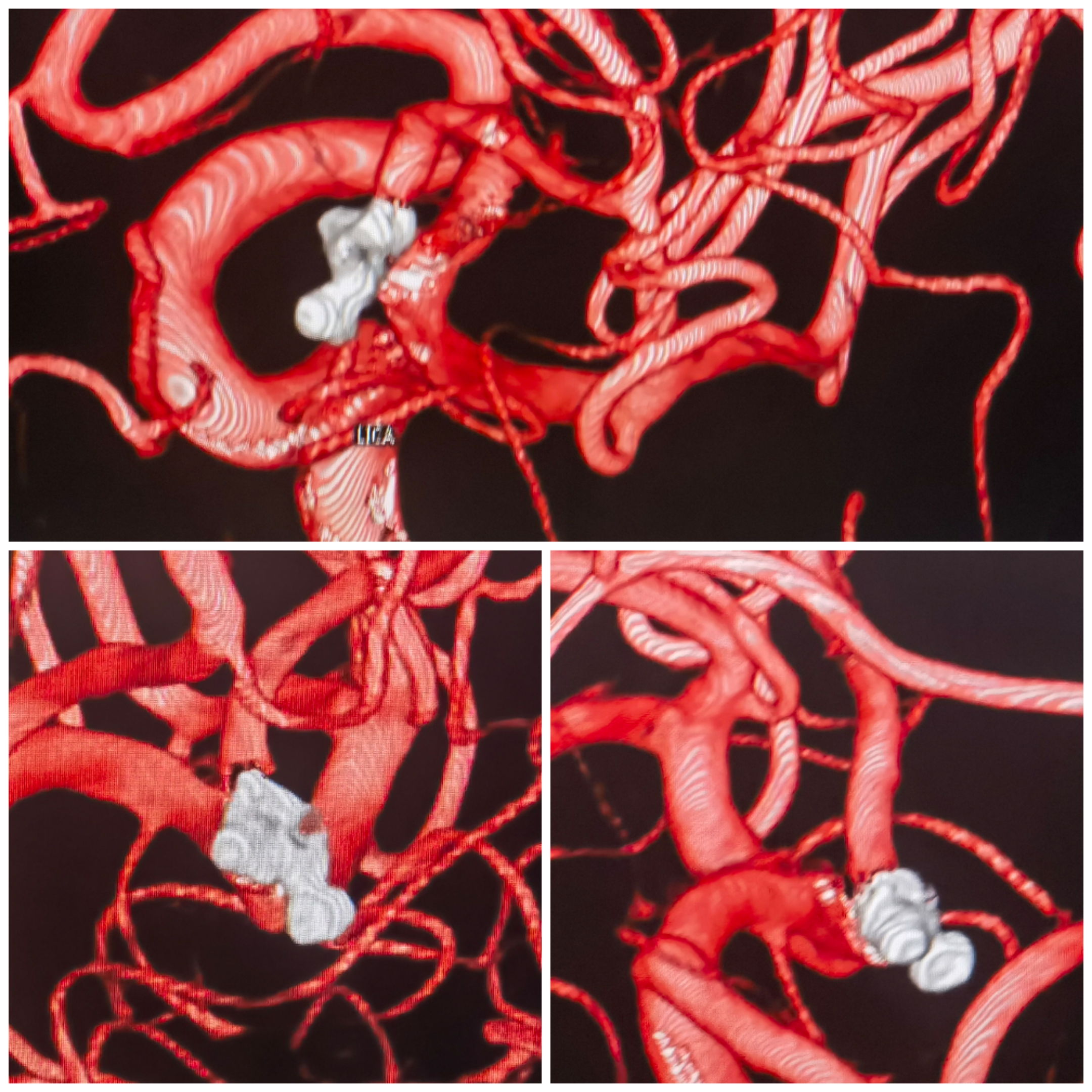 手术过程微导管布局情况:三系统栓塞,支架导管置于上干,两条微导管分别置于主囊和子囊中。