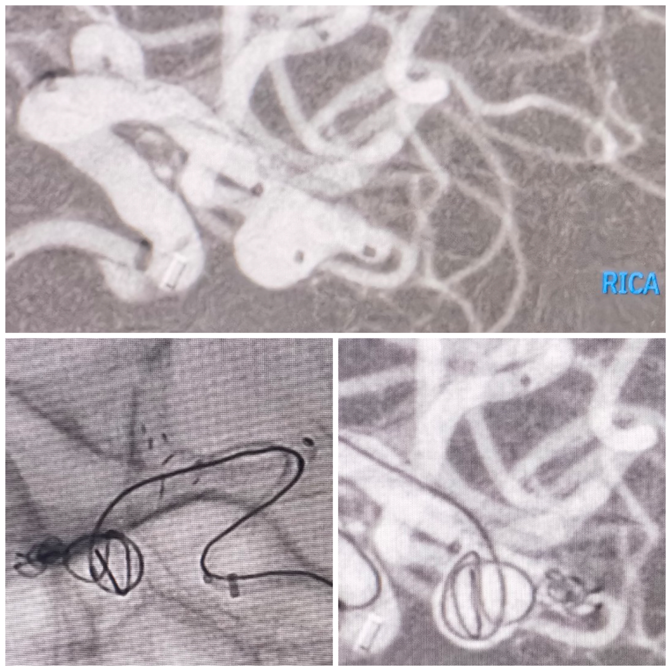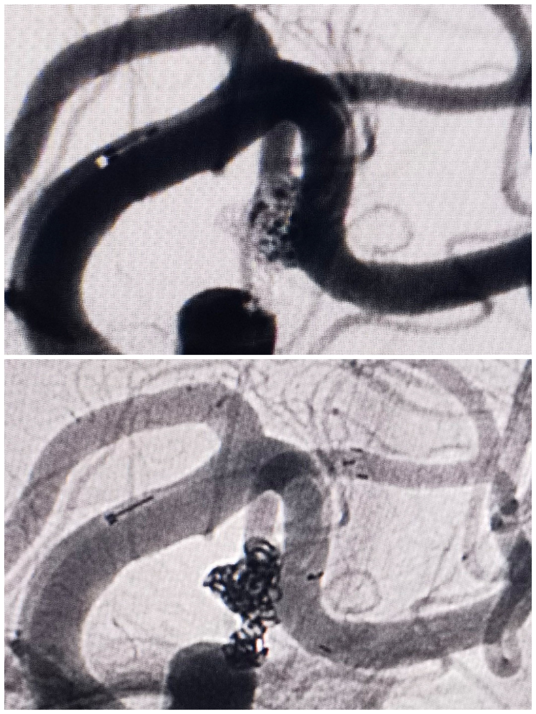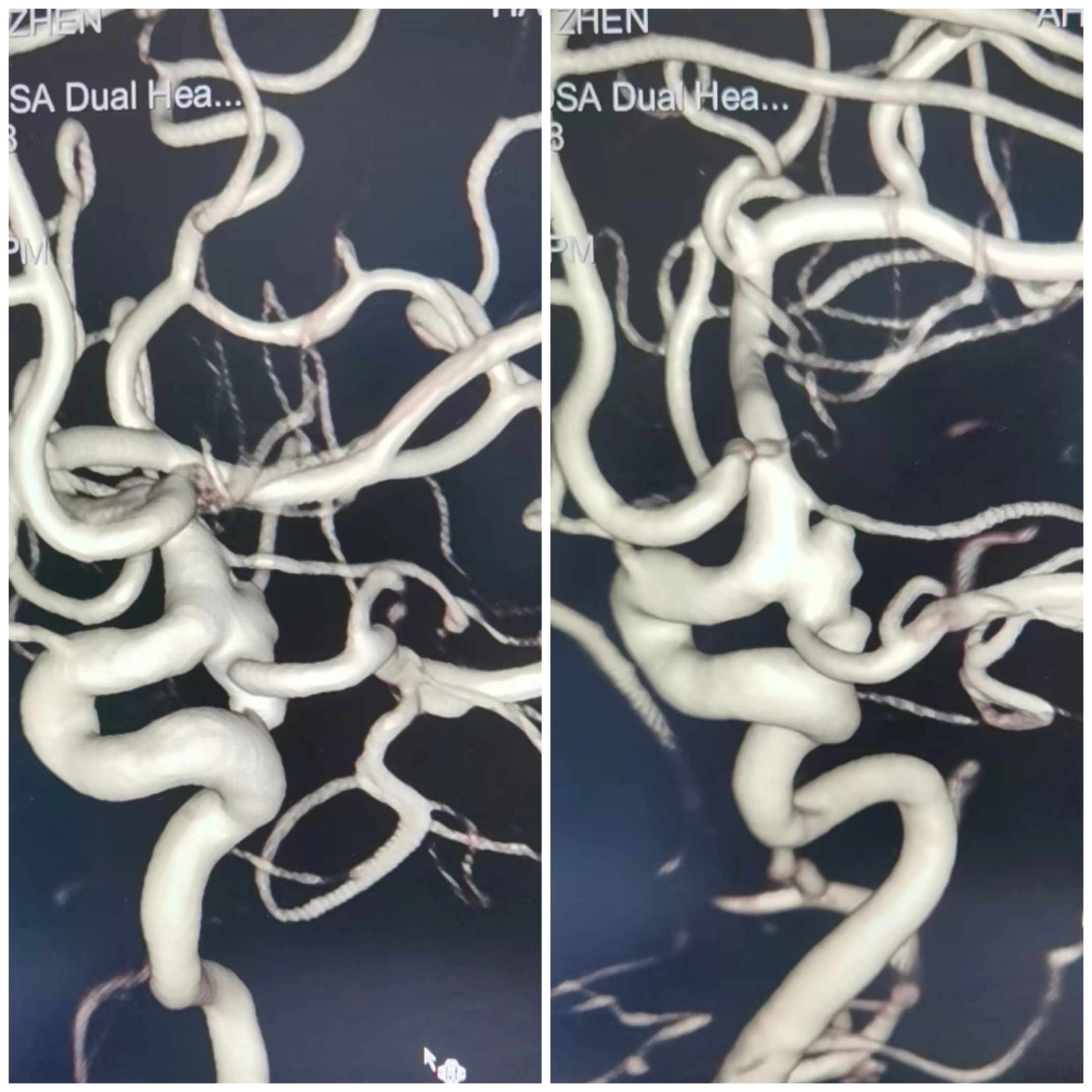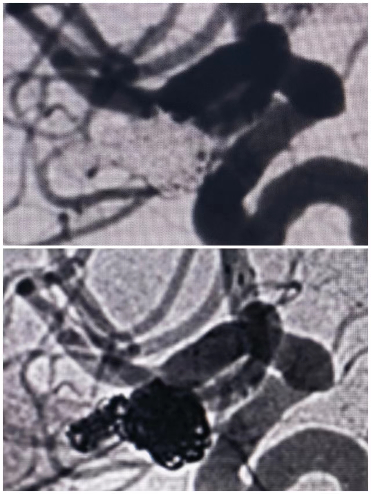 栓塞术后情况:支架甩尾保护双干,子囊及主囊栓塞完全