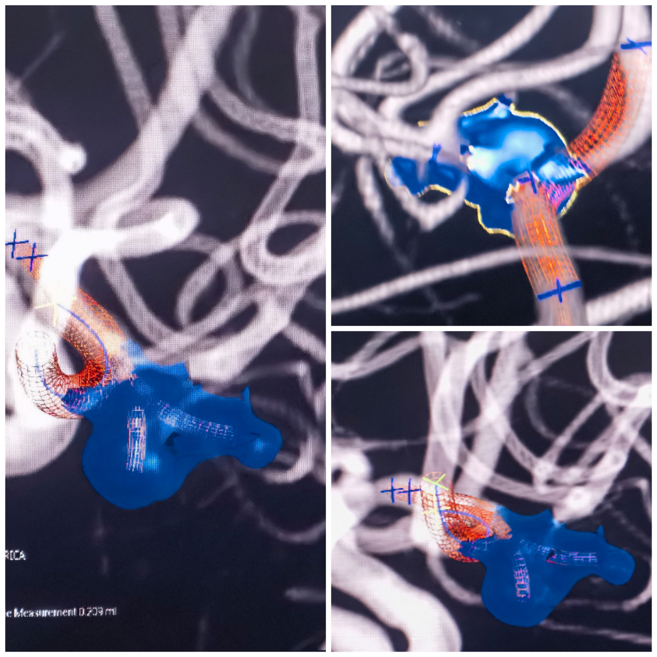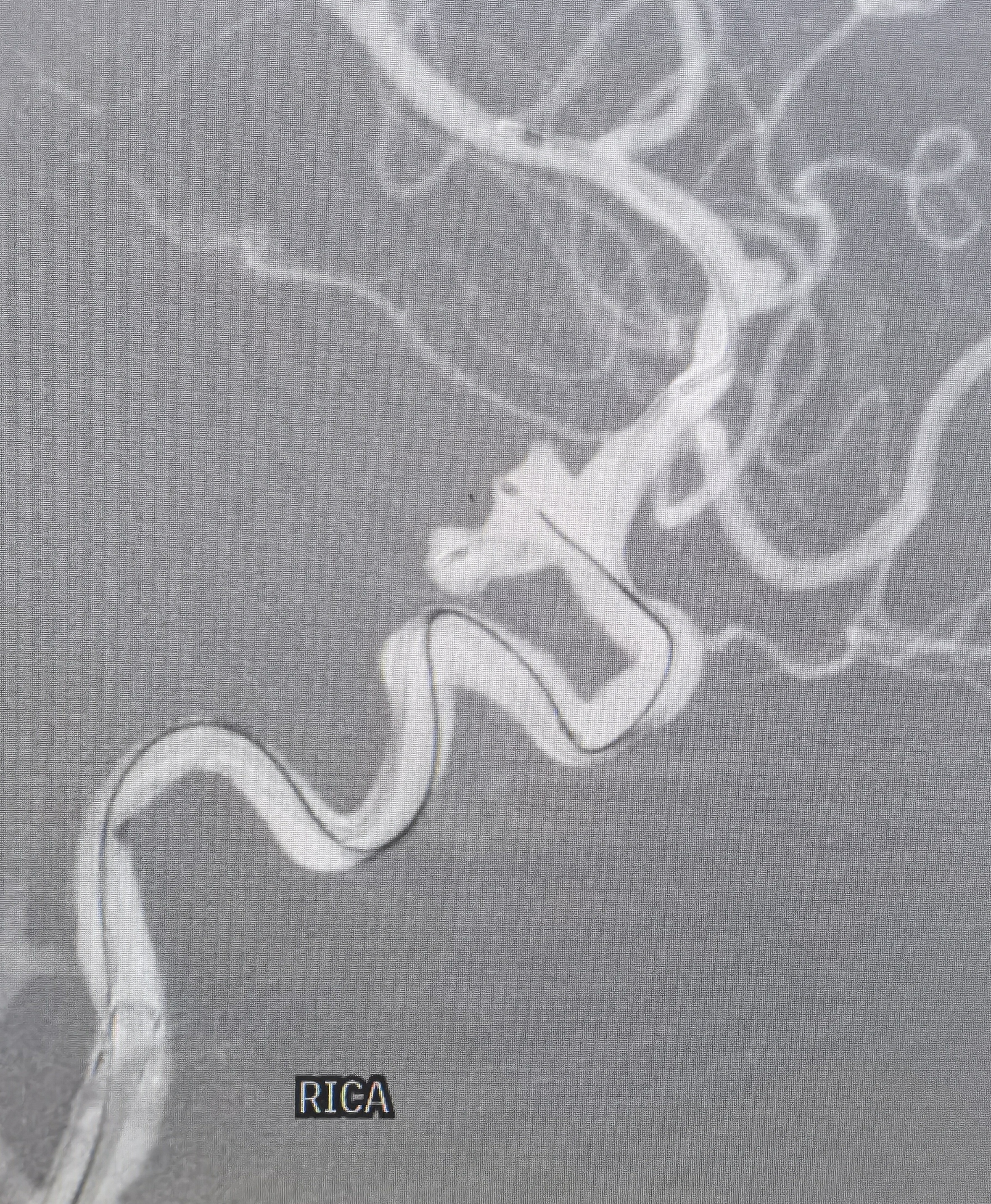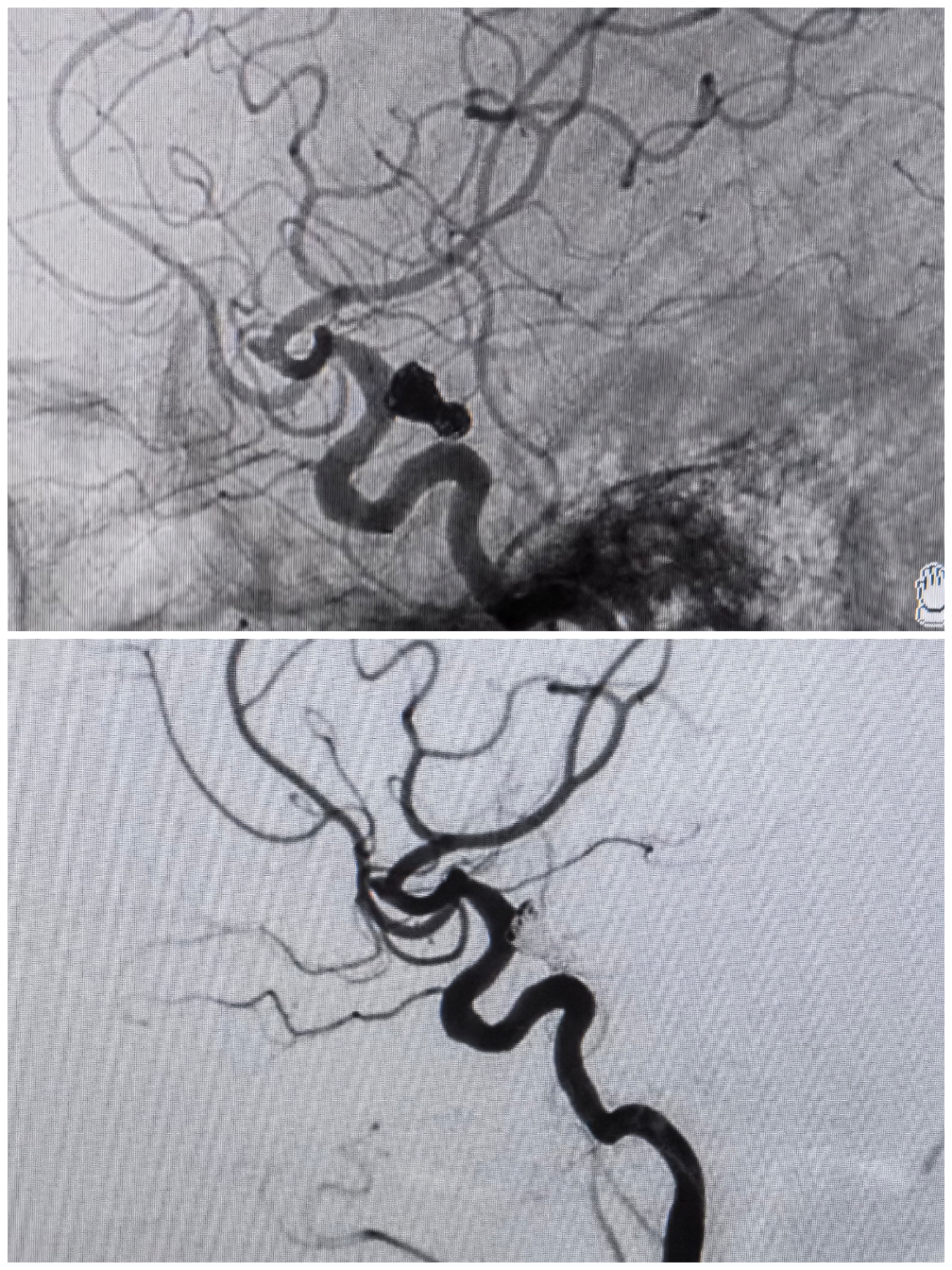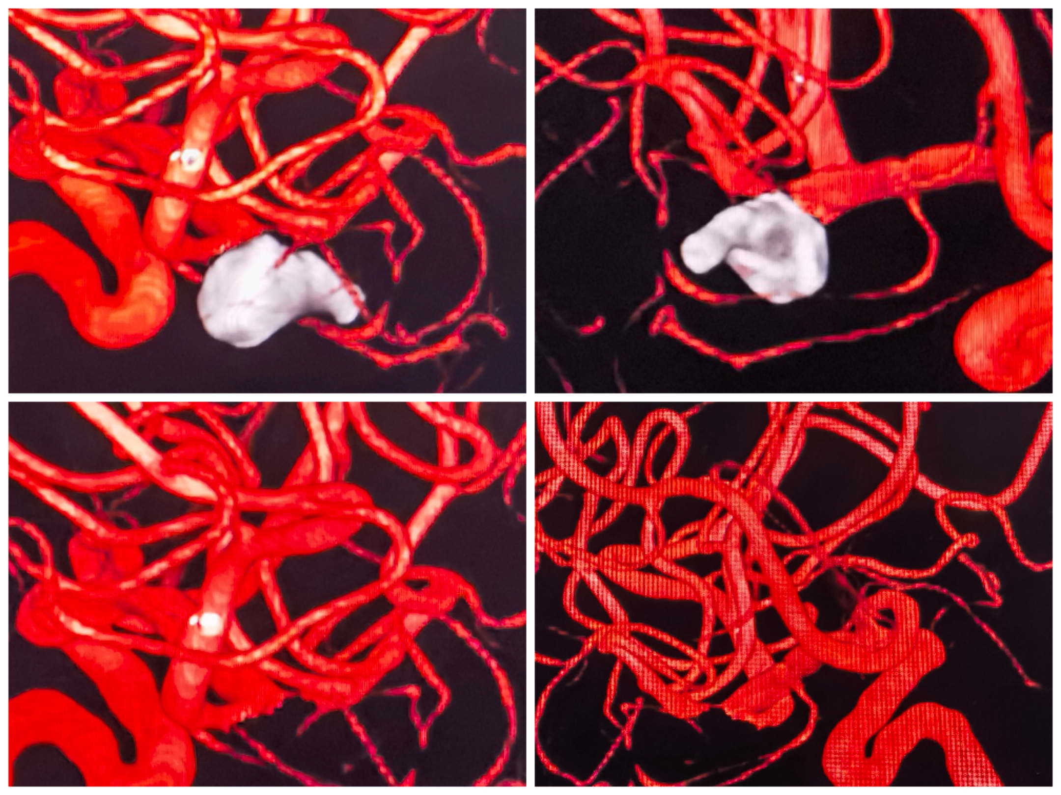 栓塞术后情况:支架甩尾保护双干,子囊及主囊栓塞完全