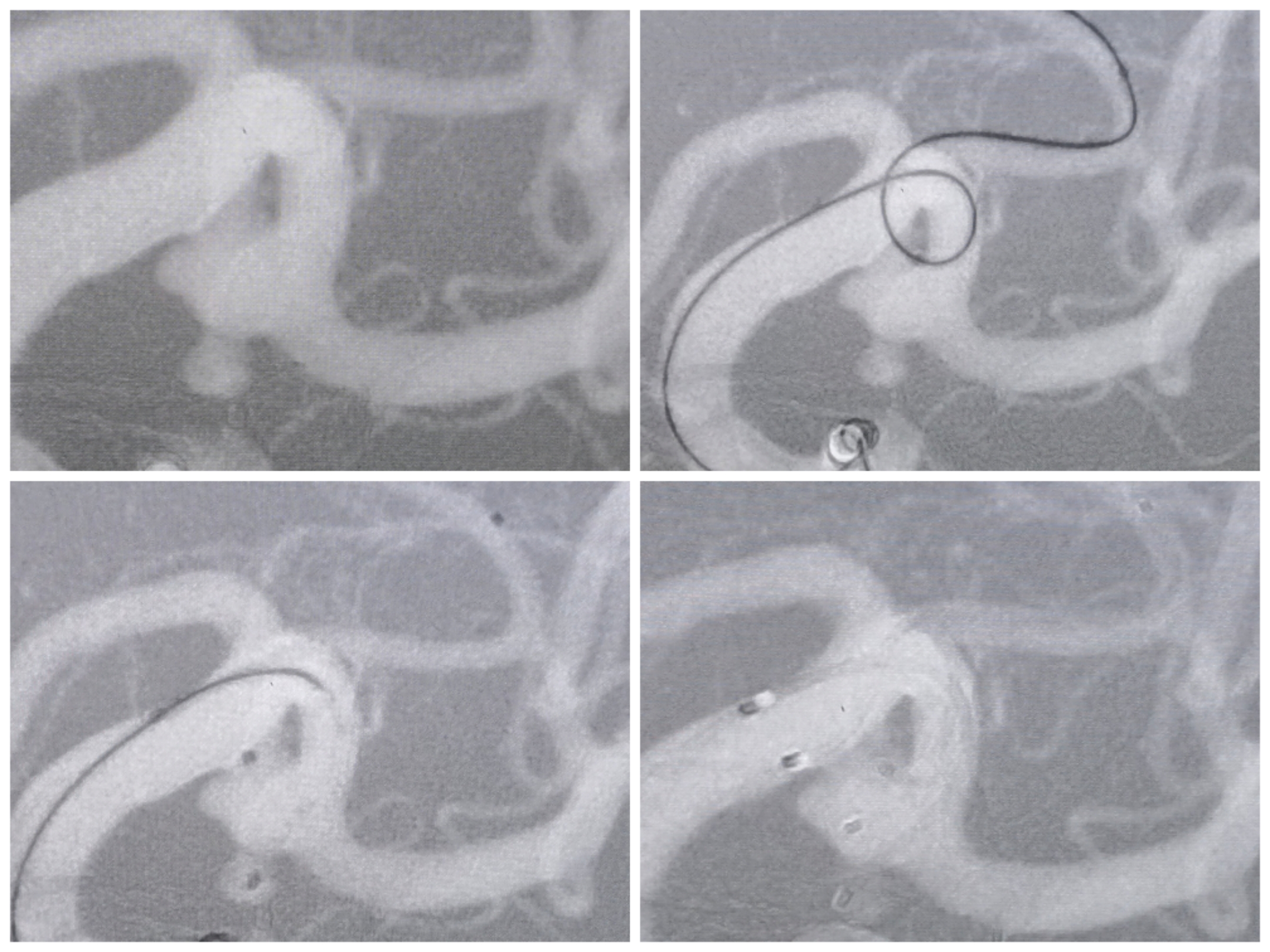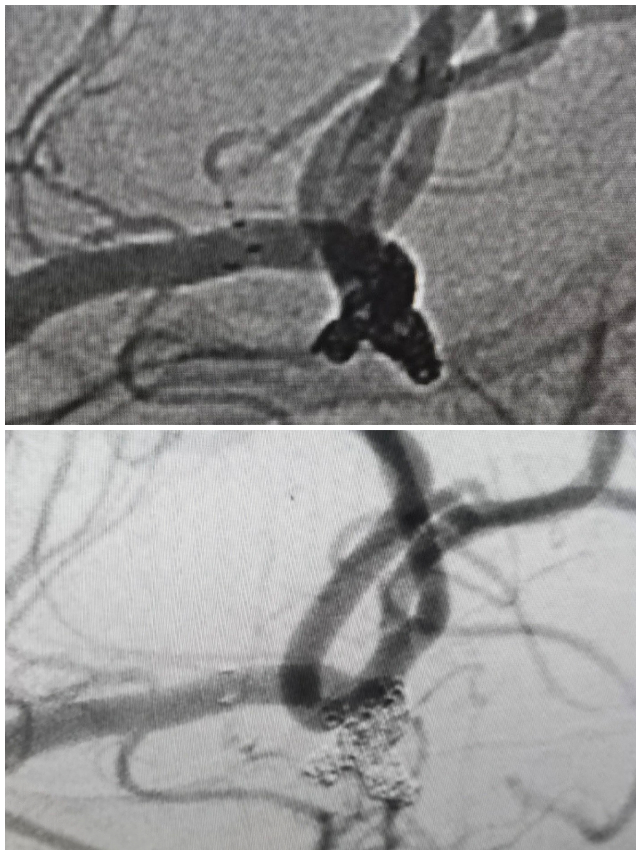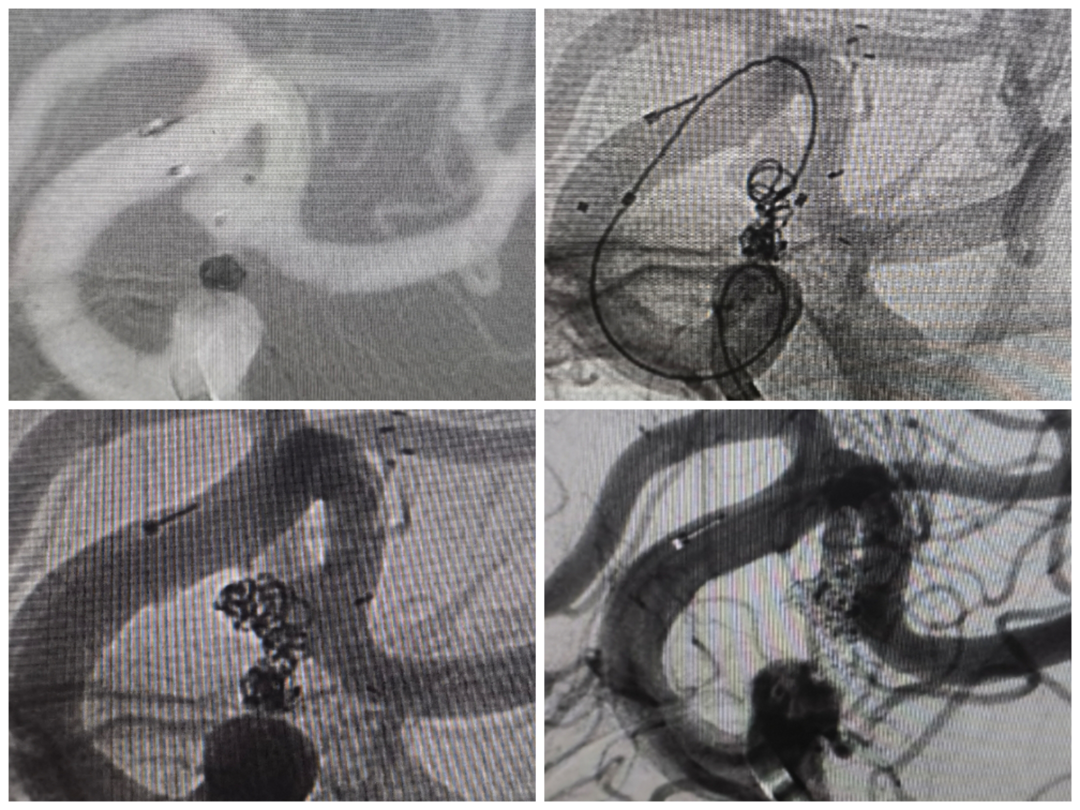 手术过程:先栓塞子囊,释放Atlas支架后甩尾(头端置于上干、尾端甩尾释放于下干开口保护两个干),后栓塞主囊