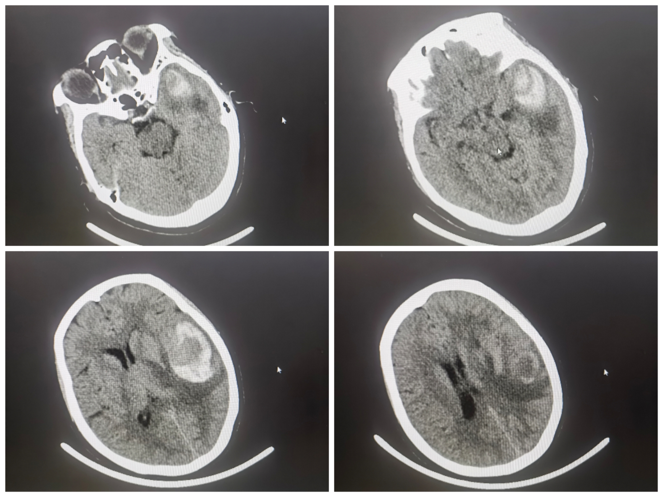 因头疼1周余就诊,行头颅CT提示左侧颞叶血肿,CTA提示左侧大脑中动脉瘤。神智嗜睡,GCS13-14分,首选开颅血肿清除+夹闭动脉瘤。患者家属反复拒绝开颅。