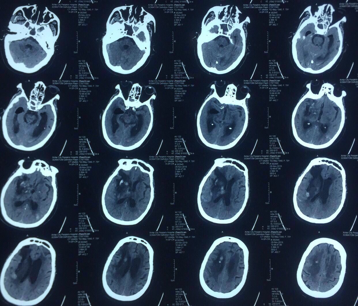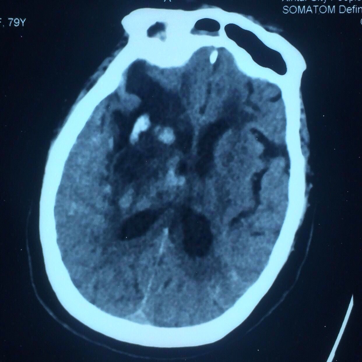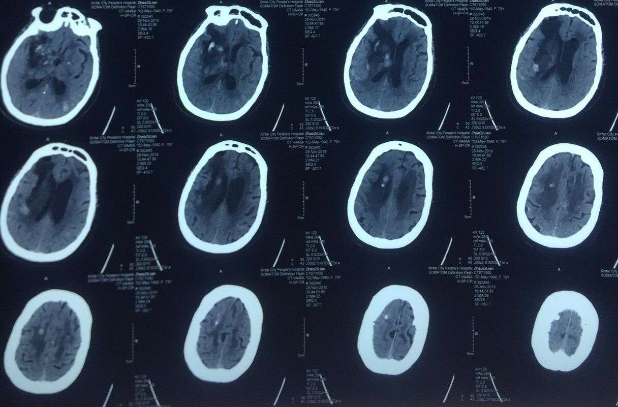 病史:女性,79岁,高血压冠心病20年,1年前脑梗死病史并脑动脉硬化、多发腔隙性脑梗死软化灶。