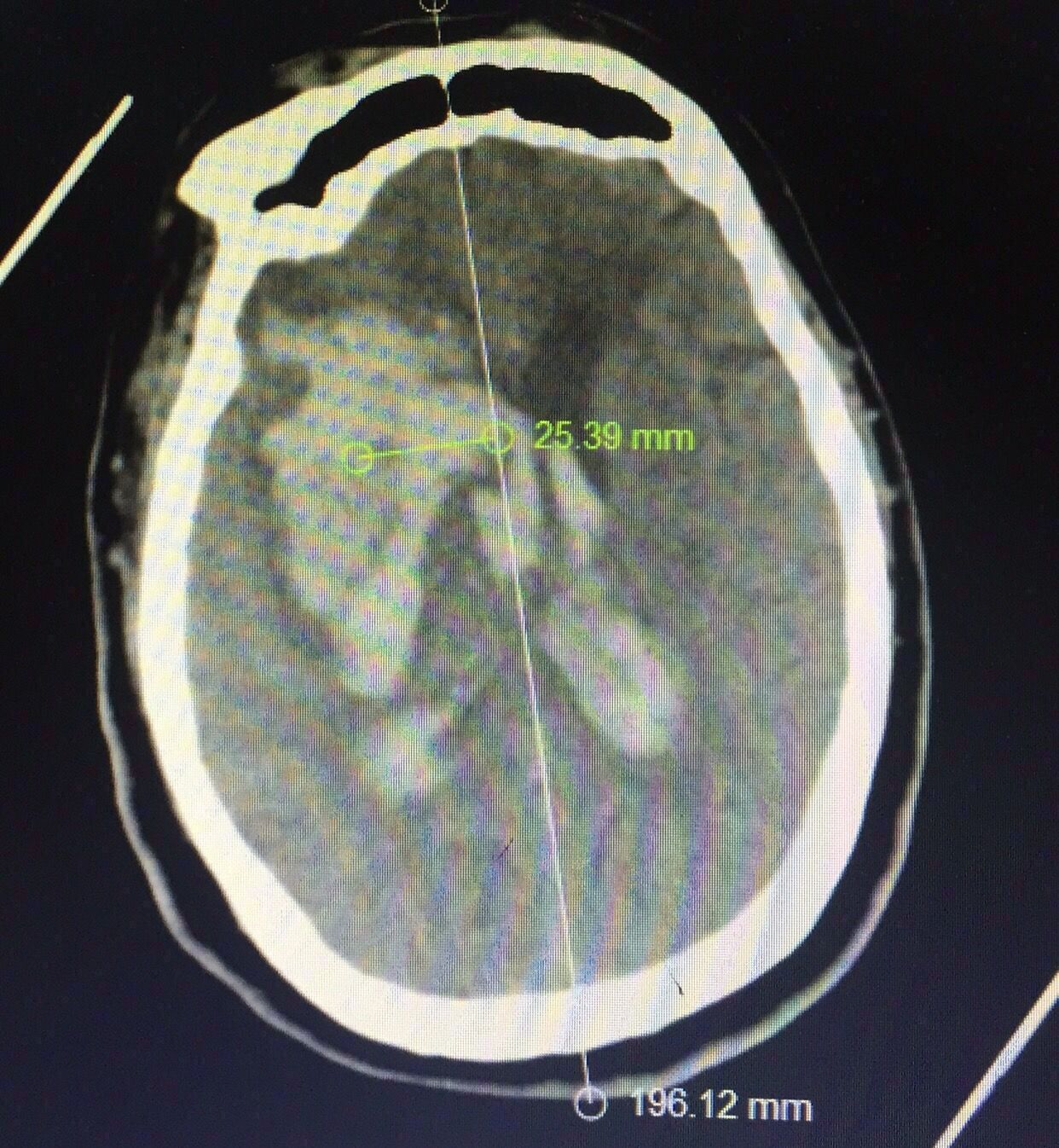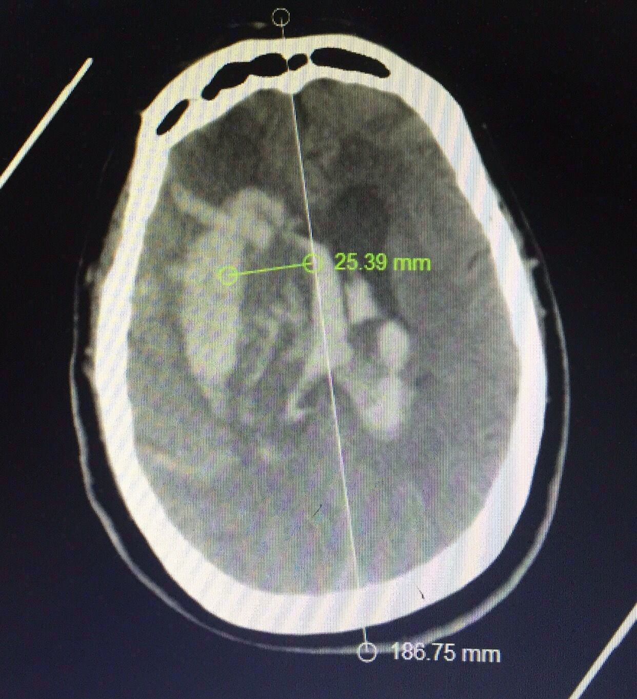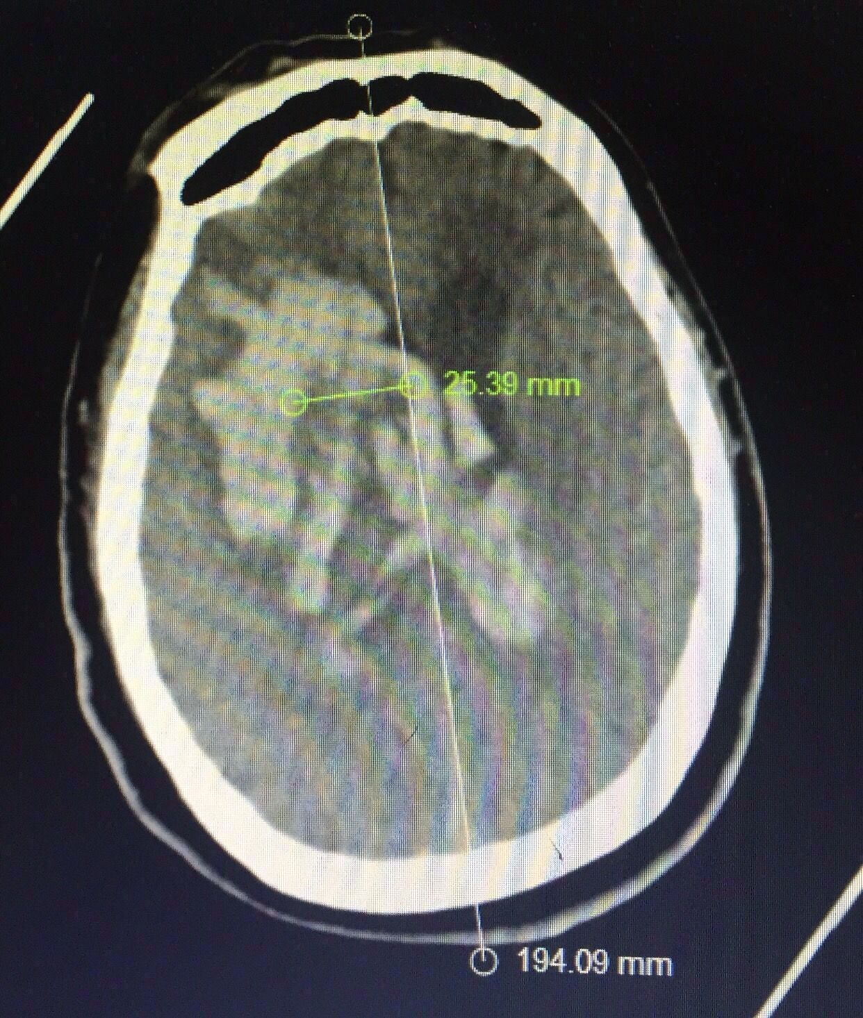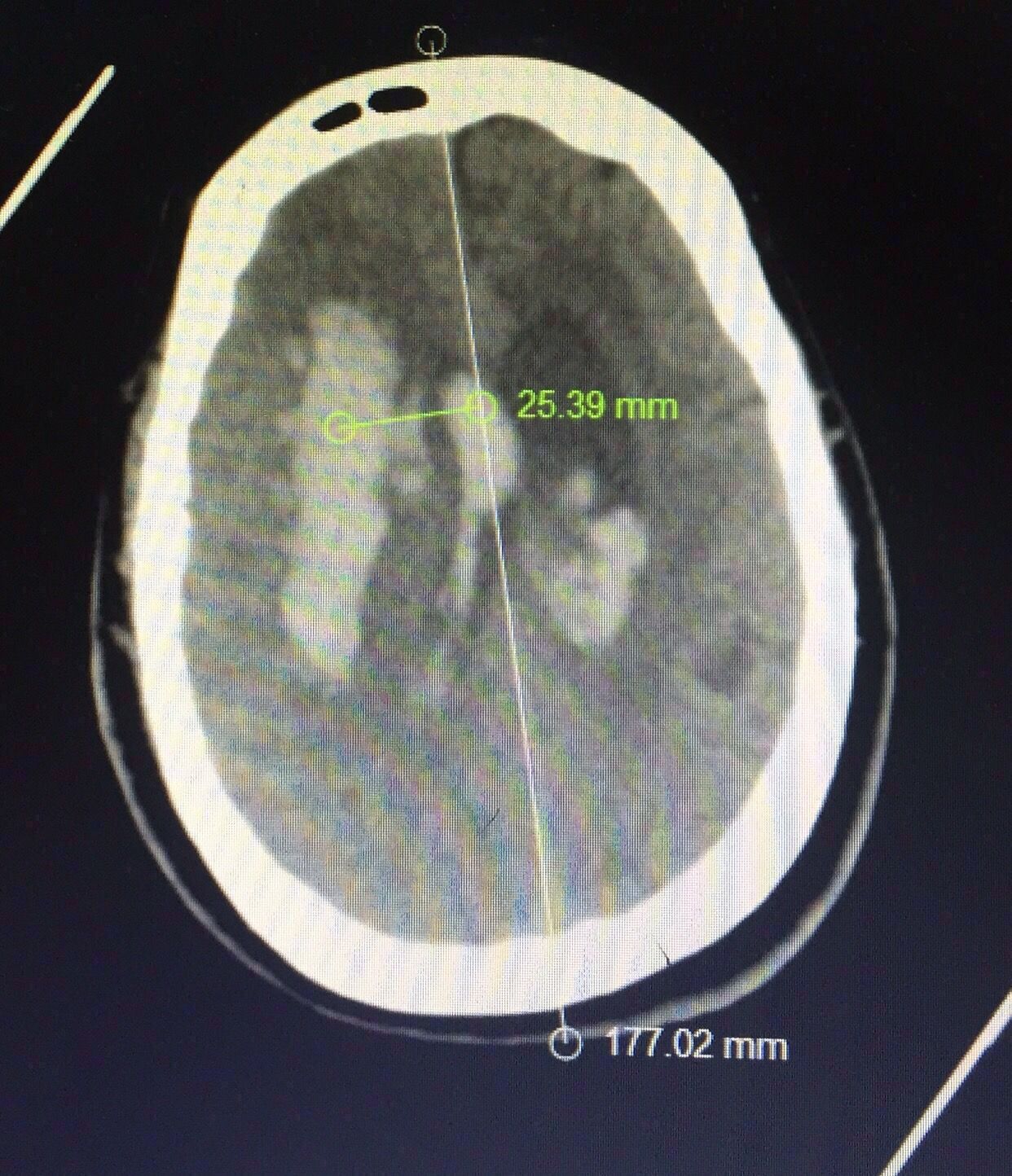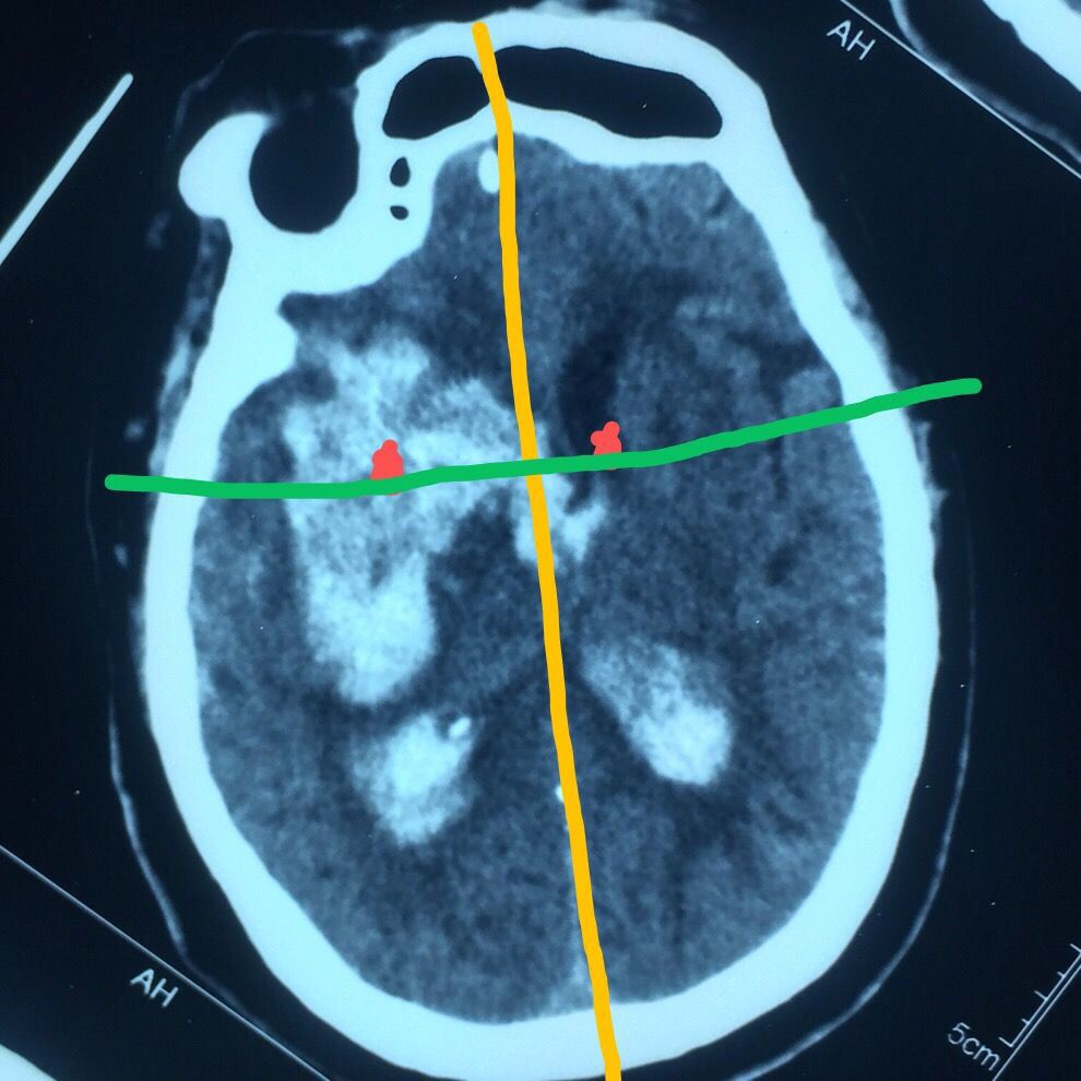 认真阅片可知,血肿最大层面就是脑室额角层面,EVD的靶点就是额角室间孔位置,我们把血肿靶点也定在这一层,右侧血肿内,右侧额角室间孔位置偏右,如图↑↑