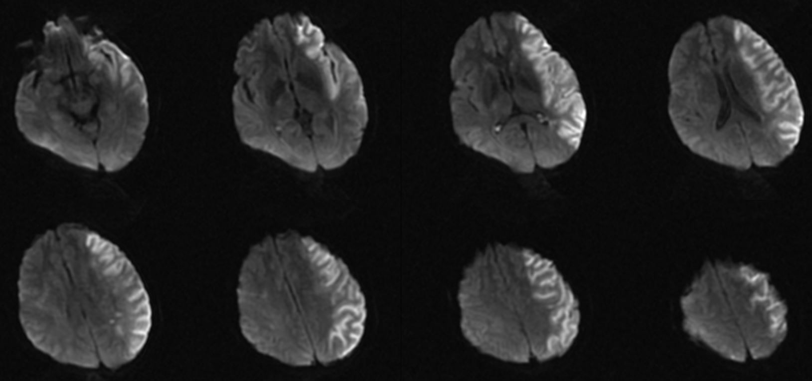 查体:神志昏睡、精神差、急性重症病容。GCS评分E2V3M5=10分,吐词不清,右侧口角、鼻唇沟变浅,示齿、伸舌不合作,双耳听力不合作,疼痛刺激能模糊定位,右侧肌力2级,左侧肌力5级,左侧病理征阴性。NIHSS评分:18分。ASPECT大脑中动脉评分2分。