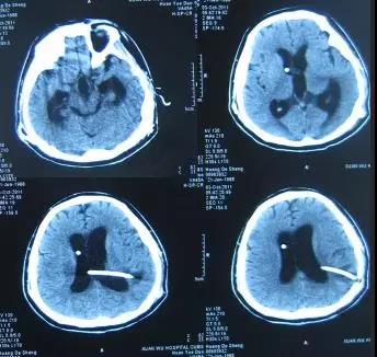 2012年7月3日进行了左侧脑室-腹腔分流术,术后复查头部CT:分流管位置良好(图-11)。