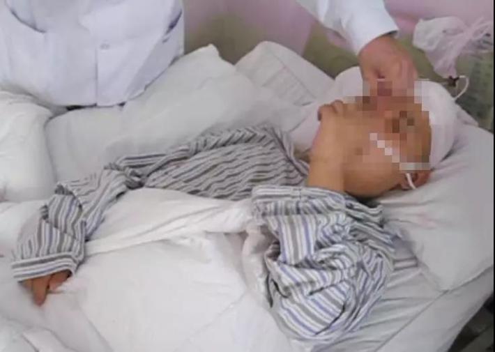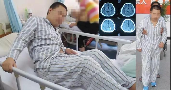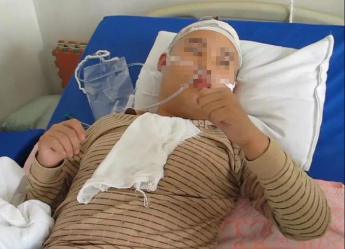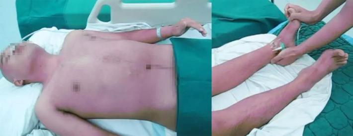 2011年10月5日转至李小勇脑脊液中心,入院时:浅昏迷状态;呼喊可睁眼,鼻饲流食,问话不能作答;双下肢刺激后可动,双脚僵硬掰不动,左下肢僵硬弯曲困难;双上肢抬起费劲:起动慢,只能微微抬起;头部、腹部手术瘢痕(图-5)。