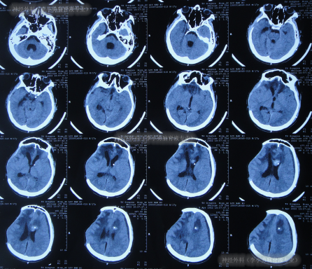因脑积水进一步加重,于2022年3月28日(去骨瓣减压术后55天),进行了脑室腹腔分流术。术后次日查头颅CT示脑室分流术后有出血(图-8)。