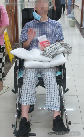 住院30天即2022年7月9日,病情好转为:能坐在轮椅上活动,右侧肢体活动正常,入院时偏瘫的左侧肢体也有改善刺痛后有痛感(图-23)。