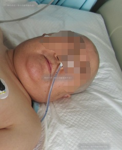 住院75天即2012年8月27日凌晨,患者自己不慎将头部外引流自行拔除,给予床旁侧脑室外引流术一次(图-17)。之后继续治疗近2月,多次脑脊液真菌培养阴性后给予停用抗真菌药物。