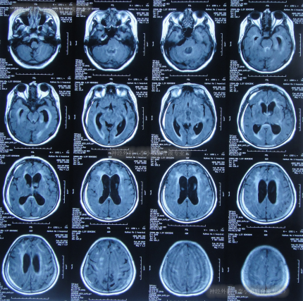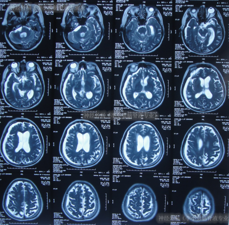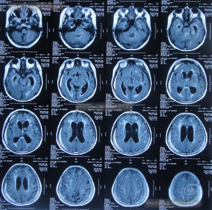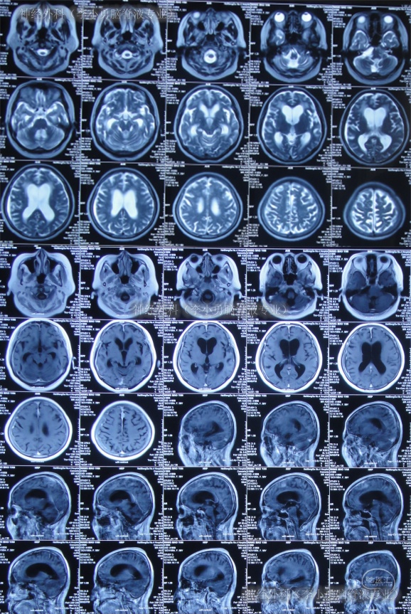 又过2月后即2011年10月14日,夜里2点起夜时突然站不稳,再次出现头昏,呕吐频繁,四肢无力,2011年10月17日第2次就诊于第2家医院:呼和浩特市某医院神经内科住院治疗,行头颅MRI(图-1)认为“末梢神经脱髓鞘病变,考虑为格林巴利综合征,轻度脑积水”。