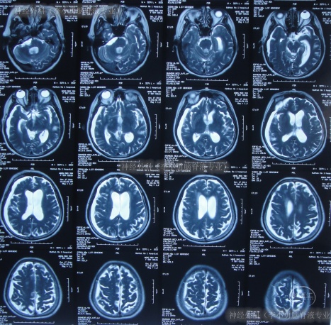 因病情越来越重,高烧不退,昏迷4次,第4家医院治疗90天即2012年5月22日,医生建议转入更高级的医院第5家医院:北京某三甲医院(胸科),查头颅核磁(图-9)和腰穿颅压仍高,脑脊液化验仍感染很重,继续给予抗结核、甘露醇脱水降颅压治疗,且给予椎管注药3次/周。