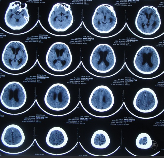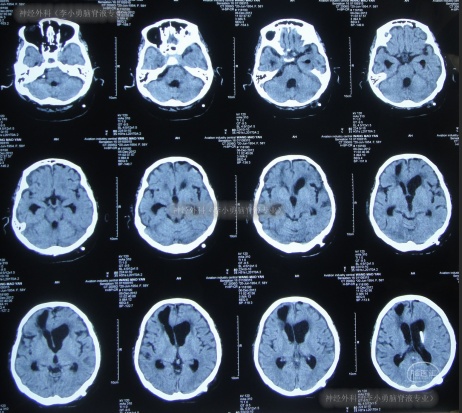 2012年6月14日,入院时:昏迷、体温很高、鼻饲、睡眠差,保留导尿(图-11)。入院后完善血、尿常规、生化全项、胸片、心电图等检查后病情危重,下病危通知。查头颅CT示脑积水(图-12)。