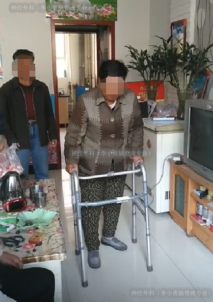 出院后4年零3月即2017年4月,家属发来视频:言语交流正常,饮食正常,且变得自己扶着辅助器能慢慢走路(图-25)。